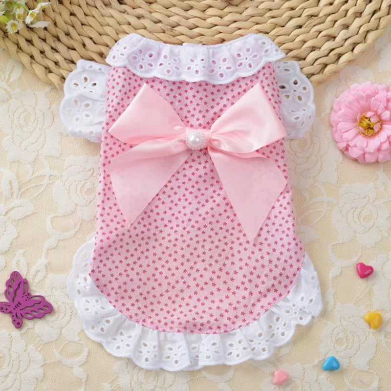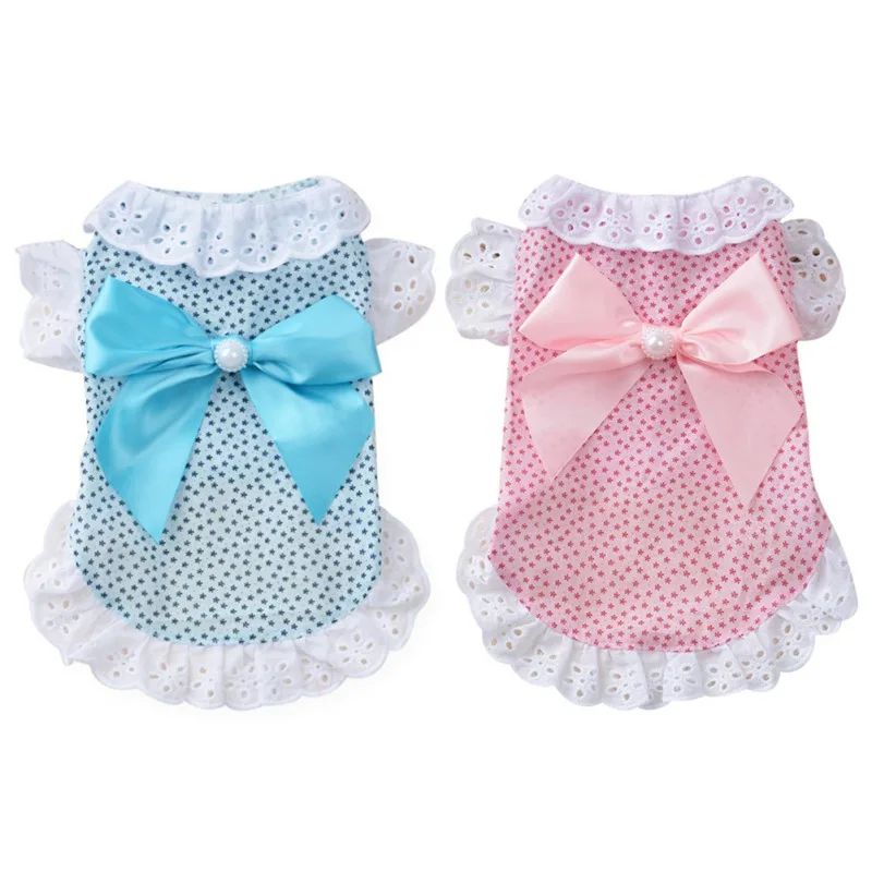 [Материал изделия]: полиэстер[Упаковка продукта]: одиночный мешок opp[Характеристики товара]: задняя длина 24 см, обхват груди 32 см, подходит для собак Тип: 1,5-2,5 кгМ: обхват груди обхват 36 см, длина 30 см применимый тип собаки: 2,5-3,5 кгL: обхват груди 40 см, длина 35 см применимый тип собаки: 3,5-4,5 кг[Вес изделия]: S:29 г M:35 г L:39 г[Особенности товара]: 1. Высококачественная хлопковая ткань, хлопковая ткань хорошо впитывает влагу, что делает ребенка комфортным2. Одежда разных цветов подходит для лета ребенка3. Дизайн с кружевным вырезом, дизайн с кружевным вырезом горловины более милый4. Прекрасный Бант, изысканное мастерство ткани с бантом с чувством блеска5. Предотвращает кожные заболевания. Побрите своего ребенка, чтобы рассеять тепло летом. Если кожа слишком сильно контактирует с землей и лужайкой, ее легко производить бактерии. Одежда может уменьшить появление заболеваний кожи собаки.