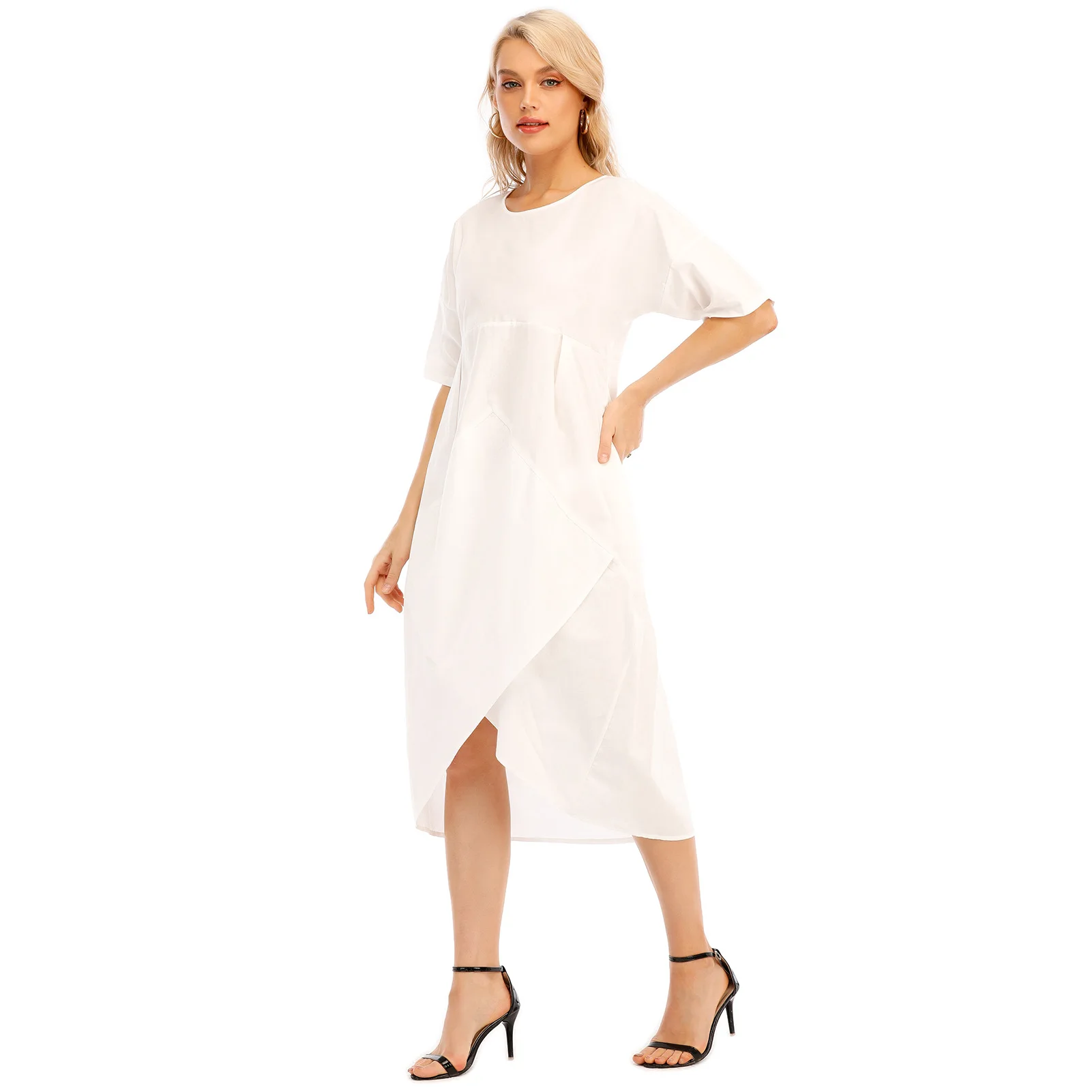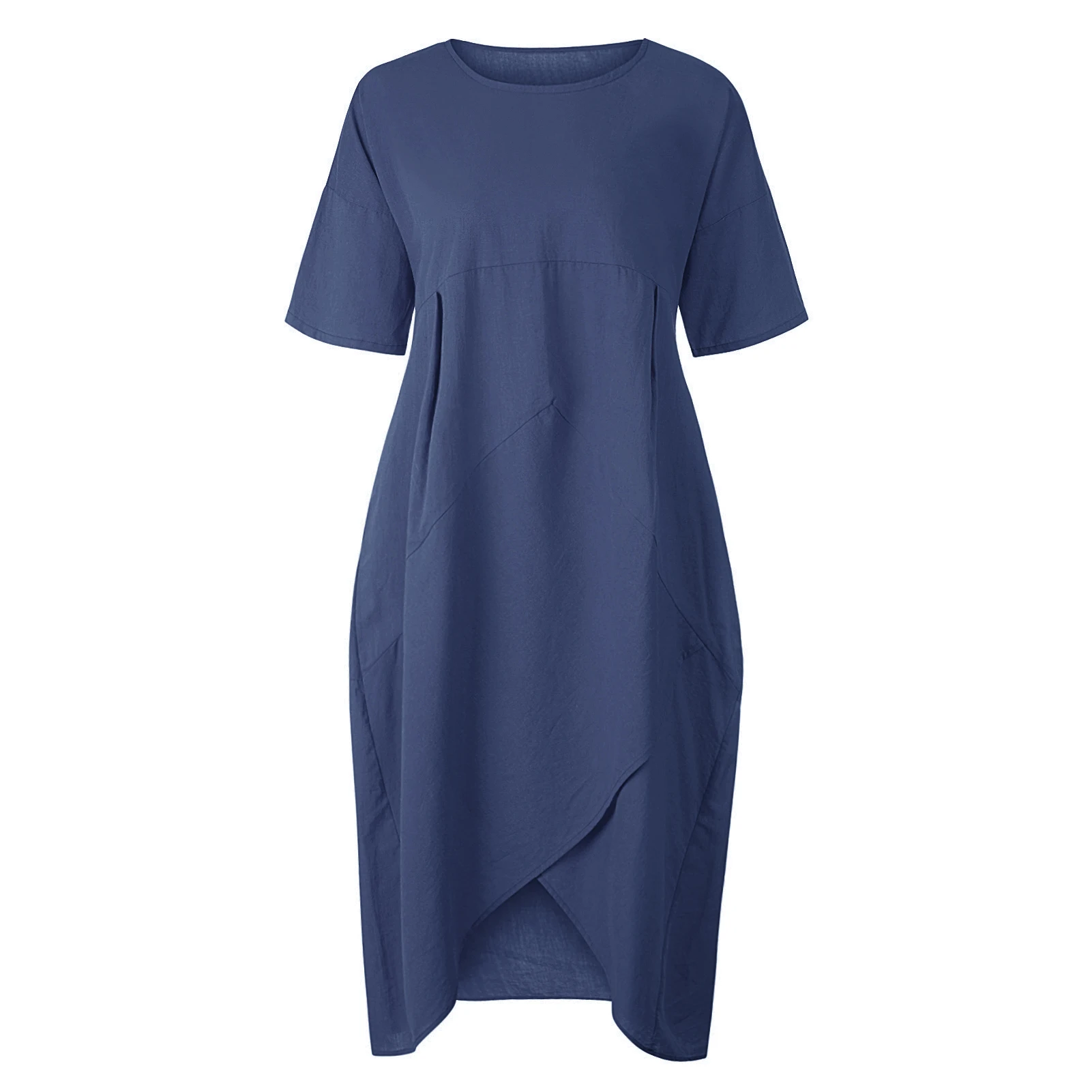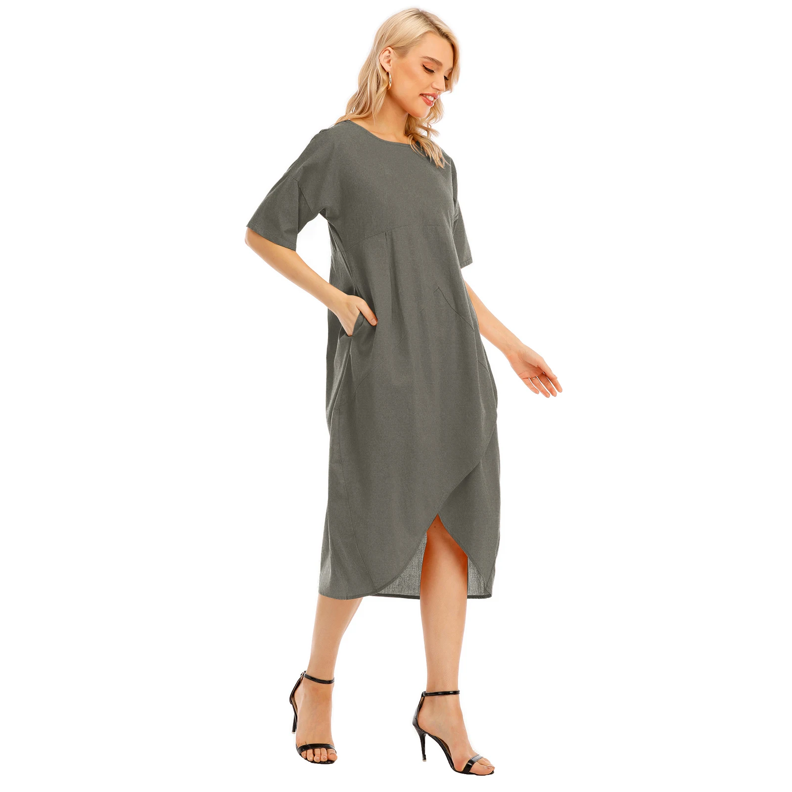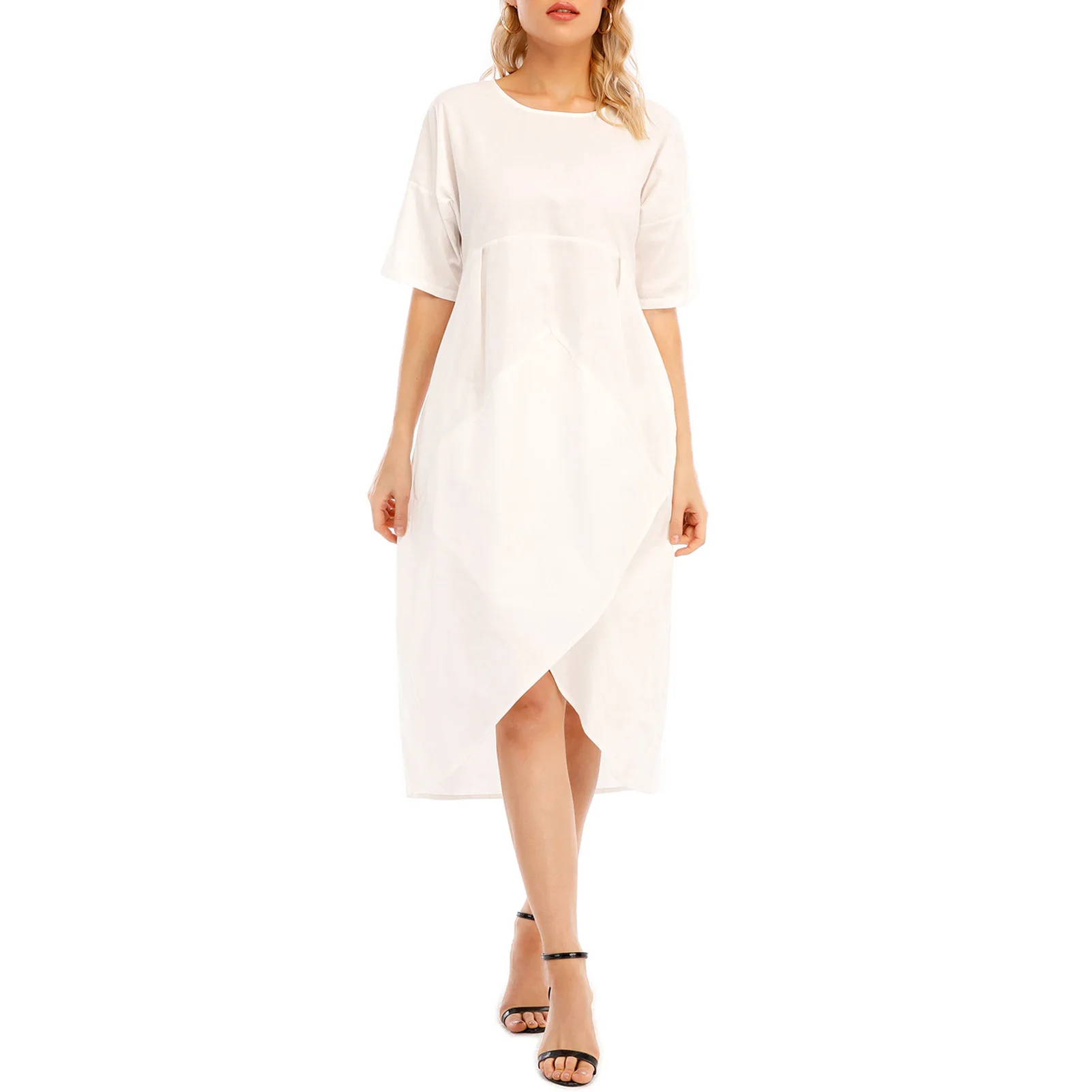EaseHut модное женское платье с круглым вырезом и короткими рукавами и высокой талией, с асимметричным нижним краем карманами размера плюс S-5XL повседневное свободное платье