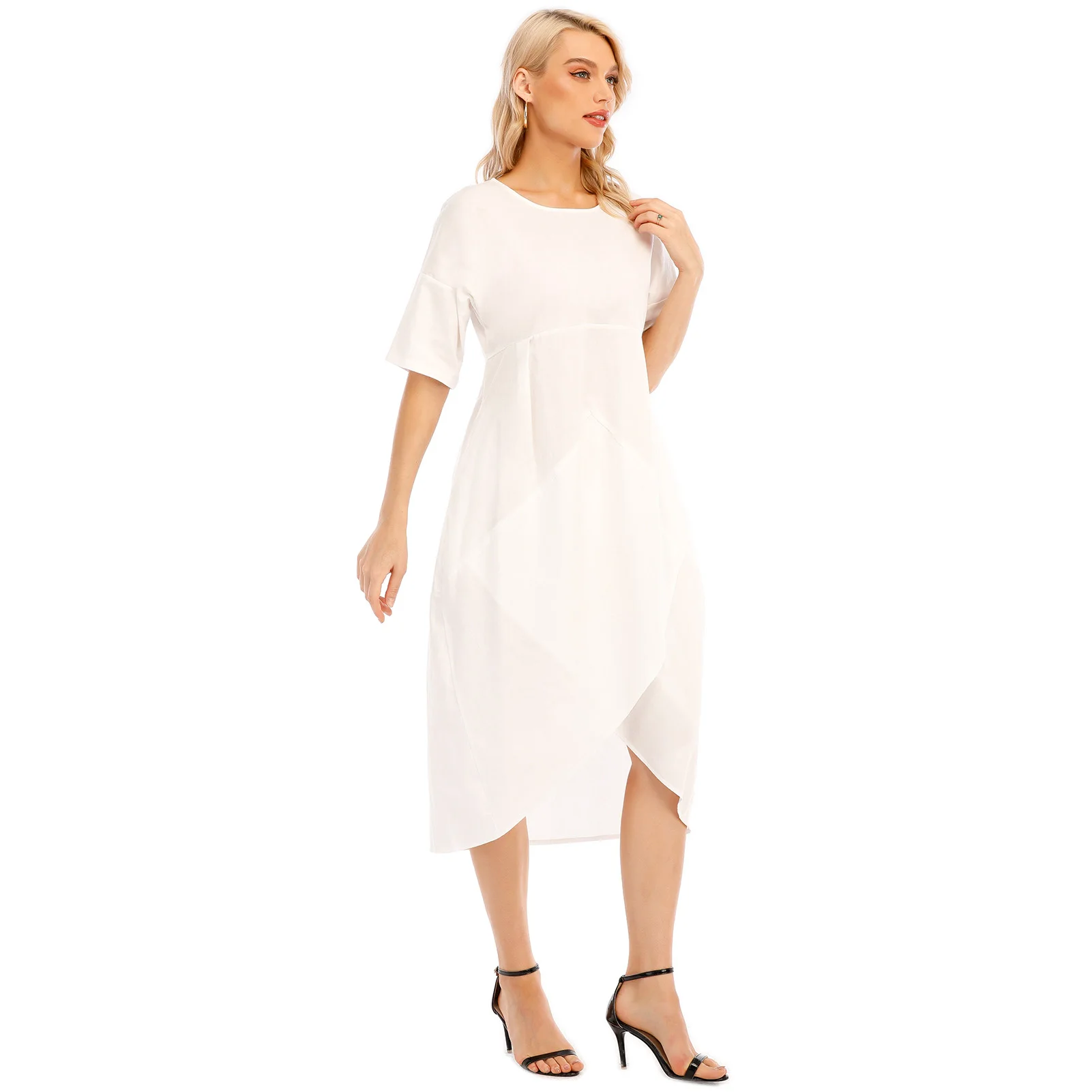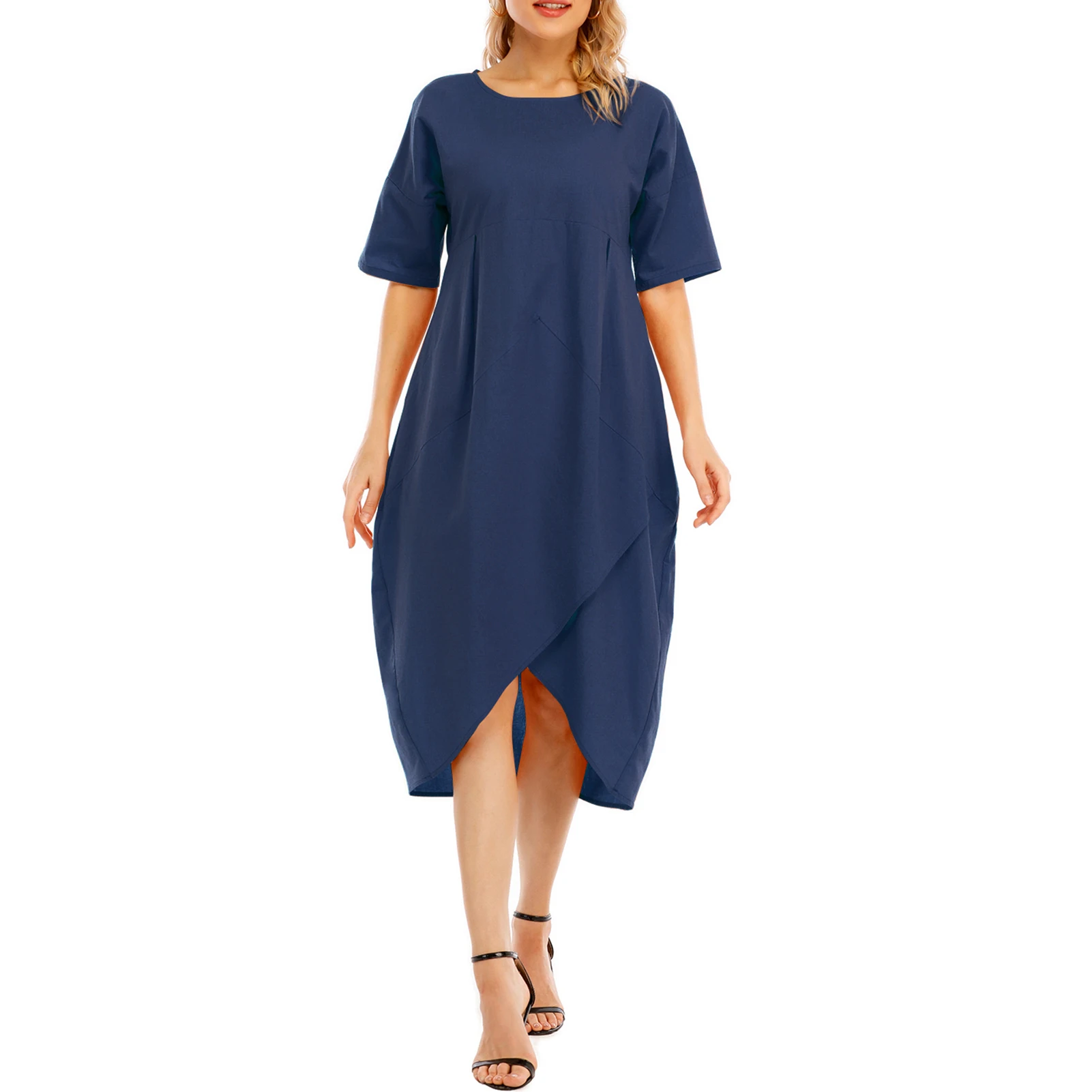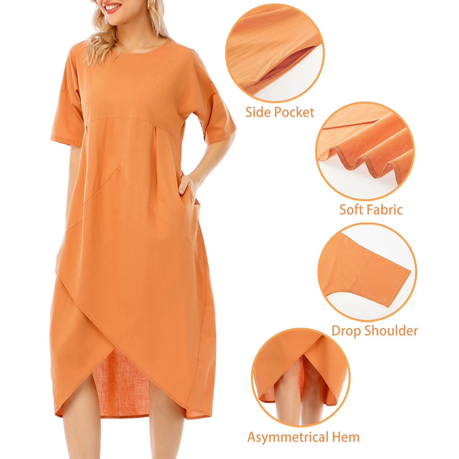 EaseHut модное женское платье с круглым вырезом и короткими рукавами и высокой талией, с асимметричным нижним краем карманами размера плюс S-5XL повседневное свободное платье