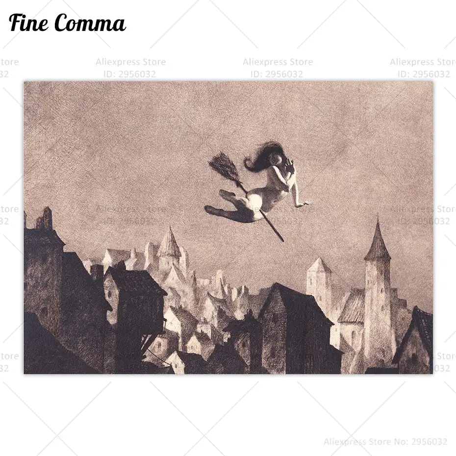 Винтажный постер ведьма с полётом к саббане, холст, настенное искусство, домашнее украшение, картина, античный домашний декор, старая картина Wicca