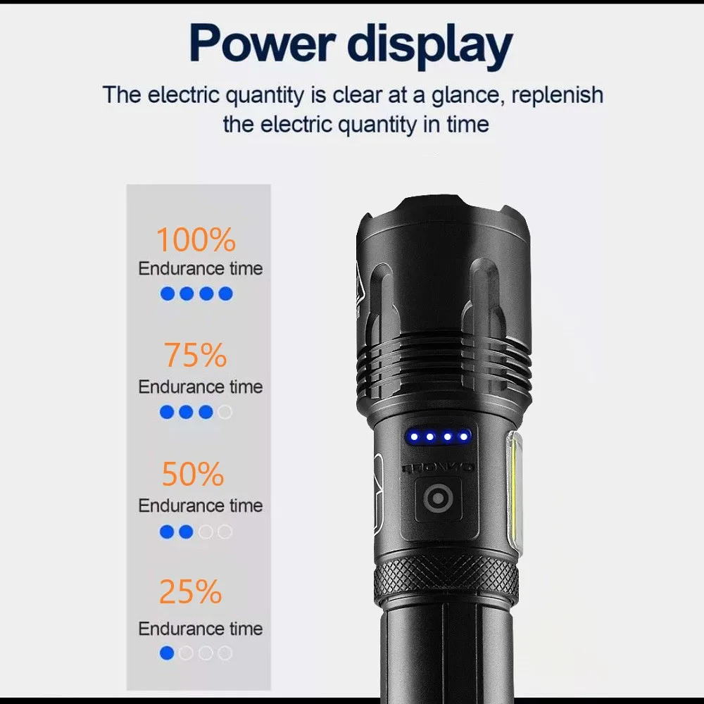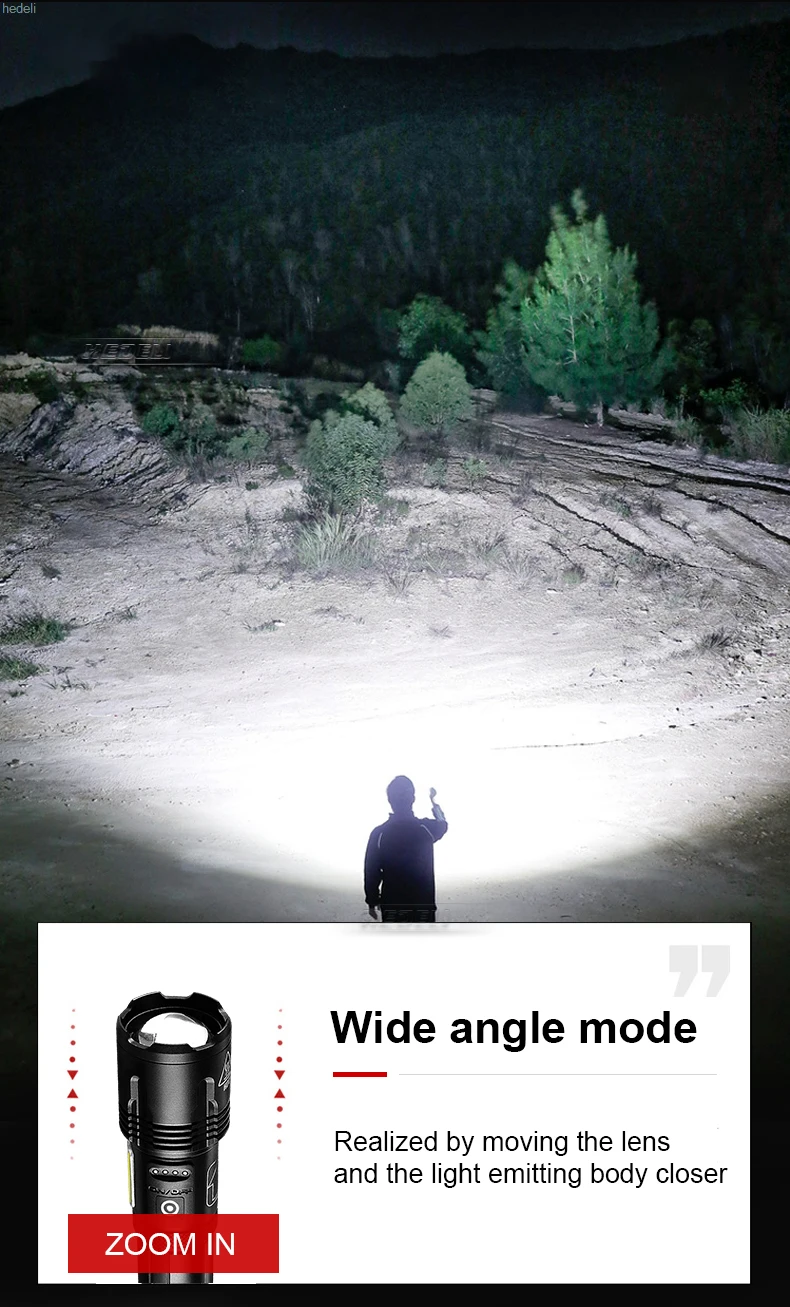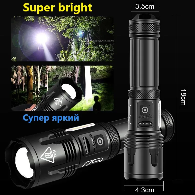 ♦Бренд: HEDELI♦Светодиодный светильник Модель: XHP160 + COB(Новое обновление 9 ядер)♦Лампа/светодиодный срок службы: более 100000 часов♦Диапазон: 800-1200 метров♦Режим масштабирования: телескопический зум♦Тип источника питания: 18650 или 26650 (аккумулятор заряжается; Не подключайте положительные и отрицательные полюсы Аккумулятора Обратно; Не смешивайте аккумуляторы)♦Время освещения: 8 часов (26650)♦Функция внешнего аккумулятора: Да (можно заряжать телефон)♦Дисплей питания: 100%-75%-50%-25%♦Режим переключения: 3 режима XHPXHP160 светодиодный (высокий-низкий-SOS) + 4 режима COB (белый светильник 100%-белый светильник 50% красный светильник 100%-красный светильник SOS)