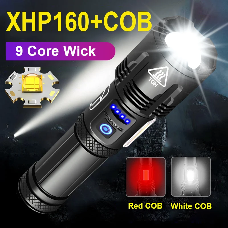 AliExpress последние обновления Горячие продукты:2021 супер яркий XHP160 + COB светодиодный фонарик, фитиль принимает 9-сердечник фитиль упаковка + выпуклая линза, которая полностью улучшает яркость фонарика, а также можете использовать аккумуляторные батареи: 18650/26650 5600mAh батареи, аккумулятор большой емкости может увеличить время освещения, которое я могу себе представить, время освещения и уровень яркости супер!