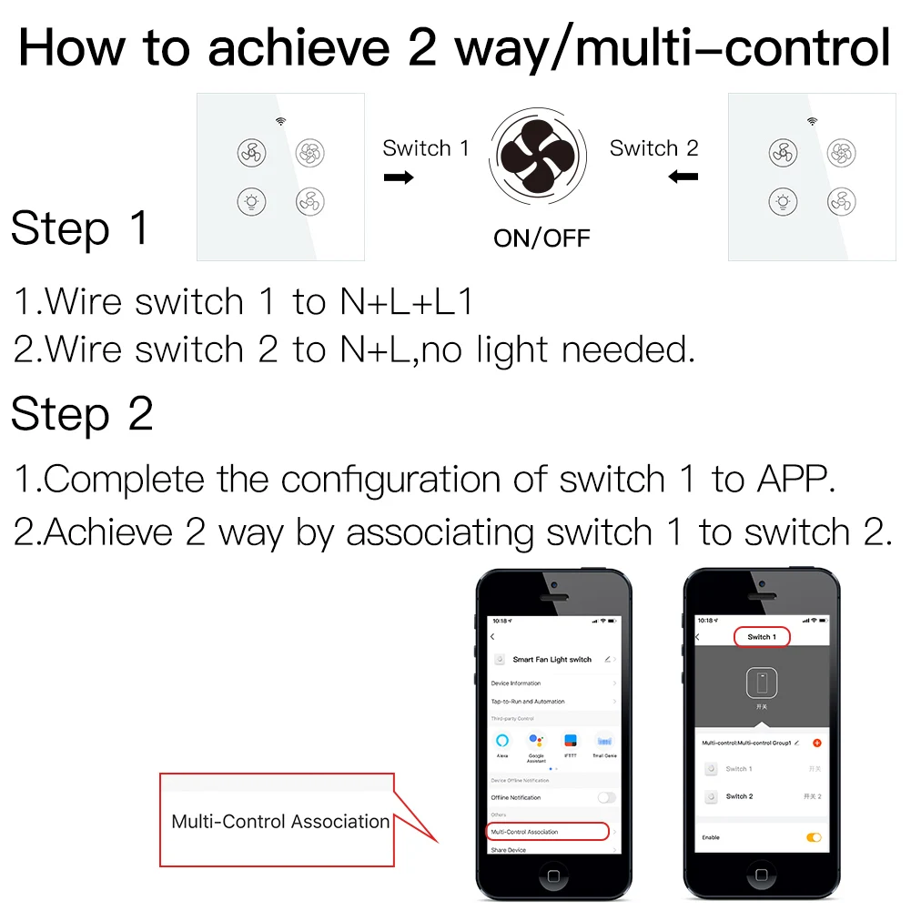 1. Регулировка режима управления: Новая обновленная версия переключателя на умный потолочный вентилятор-Светильник обеспечивает раздельную регулировку режима управления с 3 зубьями по сравнению с оригинальной случайной регулировкой. Кроме того, Он обновляет старую версию с текущим звуком от двигателя, обеспечивая новые функции, которые не будут звучать по току, когда Вентилятор включен. Больше не беспокойтесь о неприятном звуке мотора 2/3-way multi-control association для управления 1 потолочным вентилятором с несколькими переключателями; панель из закаленного стекла с защитой от царапин подходит для любого домашнего декора и обеспечивает легкое сенсорное управление; Вы можете управлять несколькими переключателями в приложении Smart Life.