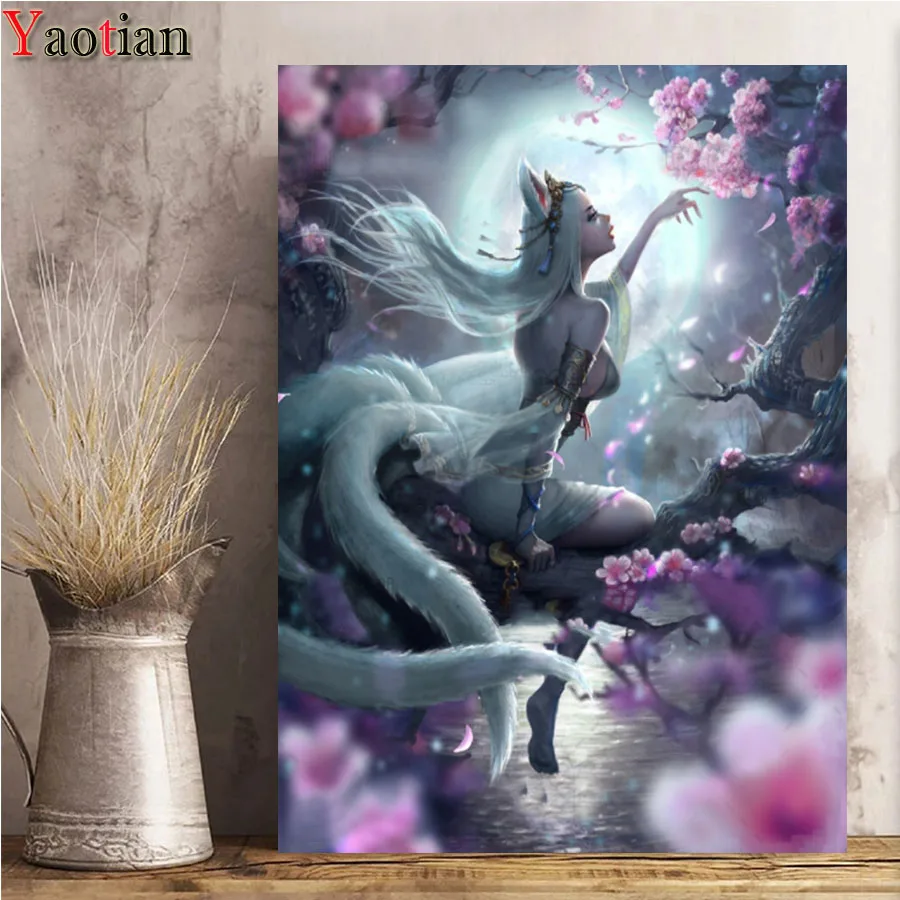 5d алмазная живопись, полная квадратная Круглая Мозаика, абстрактное искусство, девятихвостая лиса, Сказочная цветущая вишня, вышивка пейзажа бусин