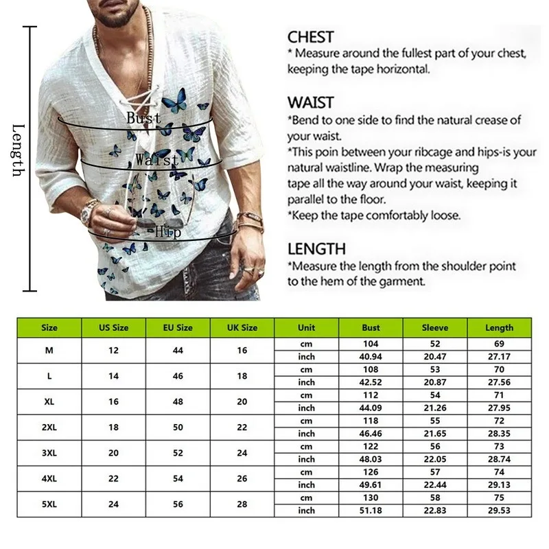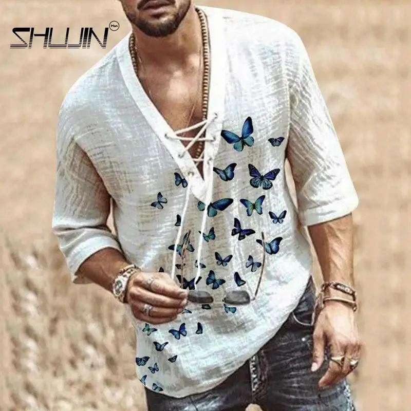 Рубашка мужская с длинными рукавами, льняная Повседневная блуза, с V-образным вырезом, в стиле бохо, винтажная удобная одежда, размер размера плюс, S-5xl