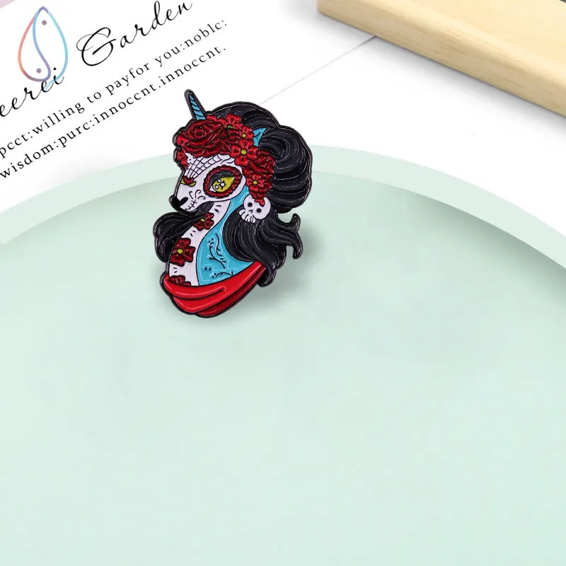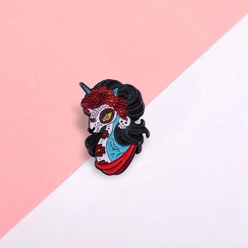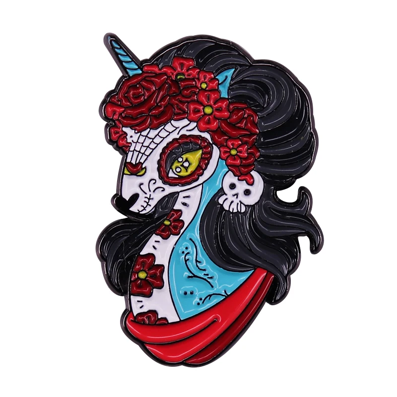 Брошь в стиле мексиканского Дня мертвых сахарный череп значок Единорог, красивая брошь-роза, волшебные странные готические украшения