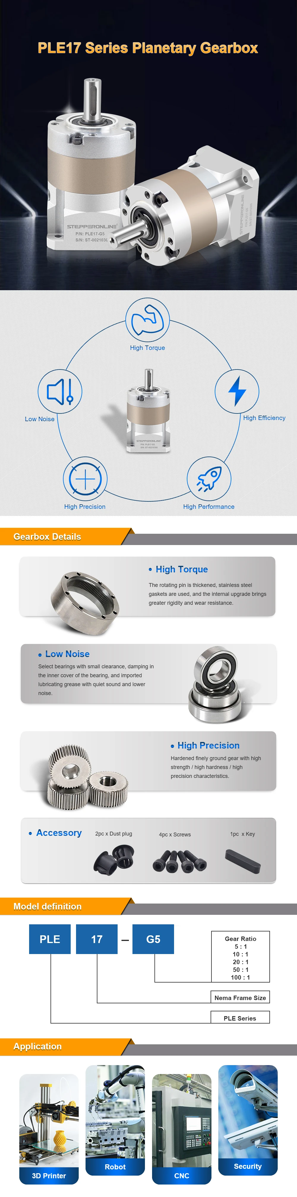 Эта высокоточная Планетарная коробка передач относится к коробке передач серии PLE, это отличный выбор для применений, которые требуют хорошей точности и надежности при исключительной ценности. Этот встроенный планетарный редуктор встроен в соединение входного вала, которое может соответствовать любому стандарту Nema 17 шагового двигателя, бесщеточный двигатель постоянного тока и серводвигатель.