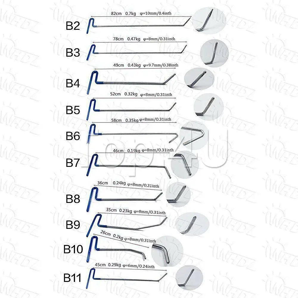 10 шт безболезненные ремонтные штоки вмятин (B2-B11) 1 шт. молоток для вмятин 1 шт. алюминиевый кран с 8 шт. головкой 1 шт. безболезненная сумка для ремонта вмятин (WHDZ) B2 - 2.69ft длина, 3,15 дюймов носочной частью. B3 - 2.56ft длина, 3,35 дюймов носочной частью. B4 - 1.61ft длина, 3,15 дюймов носочной частью. B5 - 1.7ft длина, 2,56 дюймов носочной частью. B6 - 1.9ft длина, 3,35 дюймов носочной частью. B7 - 1.5ft длина, 3,07 дюйма носок B8-1,15 футов Длина, 1,96 дюйма носок. B9-1,18 футов Длина, 5,9 дюймов носок. B10 - 0.85ft длина, 3,5 дюймов носочной частью. B11 - 1.44ft длина, 2,95 дюймов носочной частью.