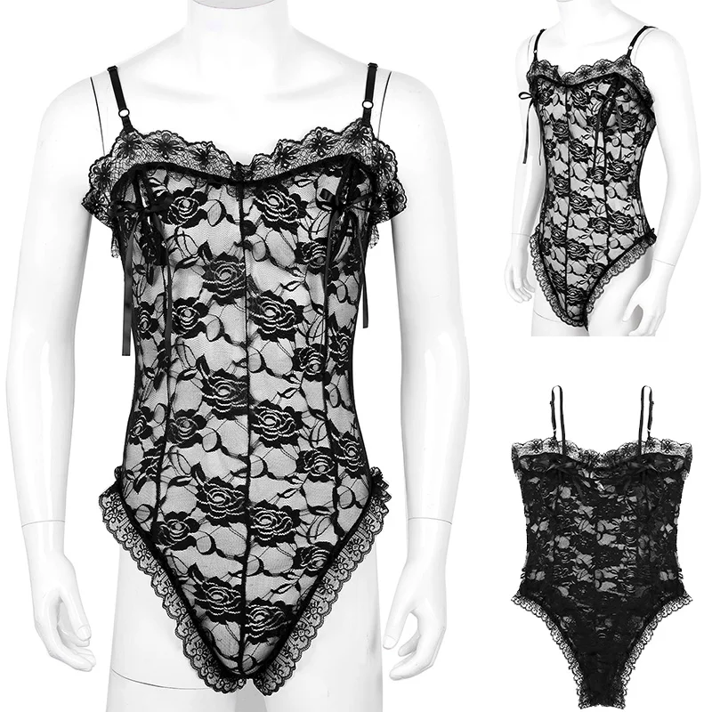 # M-2XL, мужское нижнее белье, регулируемые бретельки на бретельках, прозрачные кружевные цветочные соски, разрезы с ленточкой, стринги, боди, ночное белье, одежда для сна