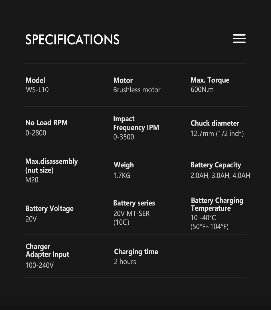 Battery Capacity2.0AH, 3.0AH, 4.0AH