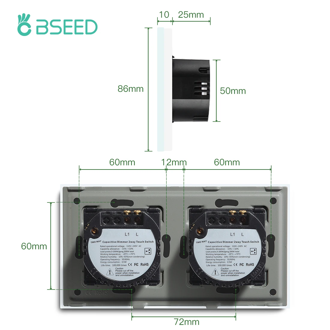 Двойной сенсорный выключатель света BSEED, 1 клавиша, 2 канала, диммер, прозрачная панель, Настенные переключатели, сенсорный датчик, светильник ильник с регулируемой яркостью, стандарт ЕС