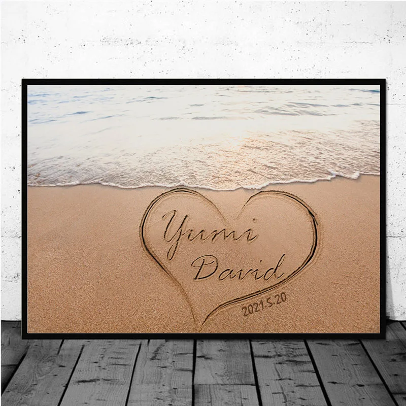 Этот персональный художественный принт отображает романтическую сцену, где вы можете улететь в личное место на потрясающем солнечном пляже. Позвольте себе расслабиться и насладиться «морским бризом»! Каждая пляжная фотография в рамке индивидуально персонализирована с именами по вашему выбору, написанными сердцем в песке.