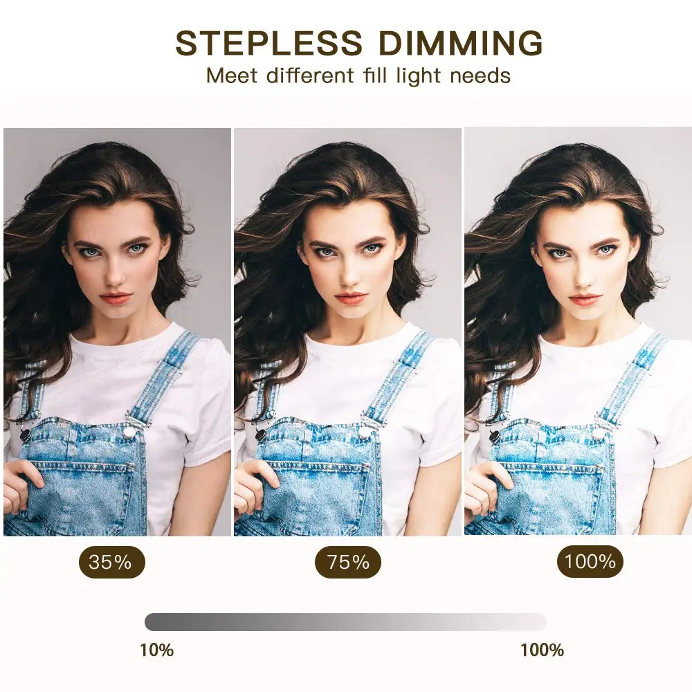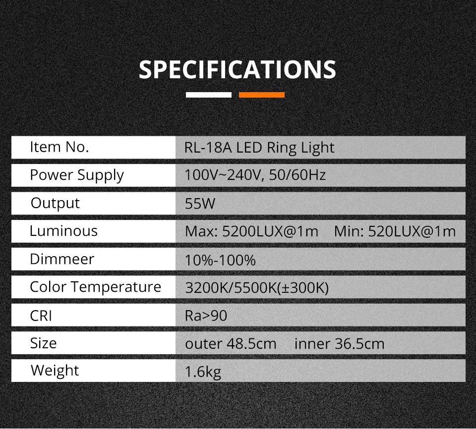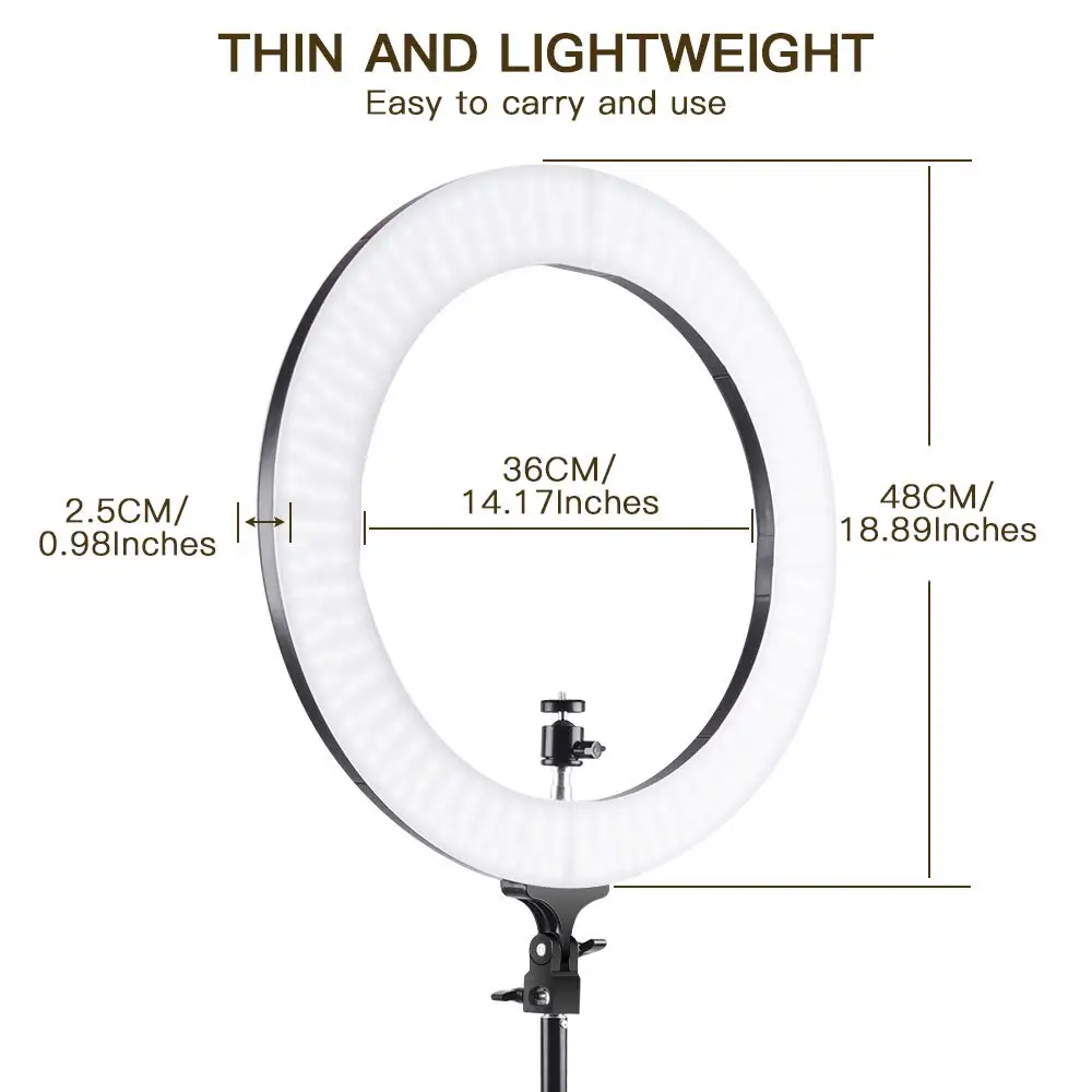 Диммируемый 18 "светодиодный SMD кольцевой светильник с широким диапазоном затемнения от 1%-100%.С 512pcs специальный светодиодный SMD дизайн, легкий и портативный. Постоянный ток, низкое энергопотребление.Отсутствие ультрафиолетового и инфракрасного излучения светильник излучения, низкая теплоотдача, безопасность и защиту окружающей среды.Длительный срок службы более 50000 часов.С усиленной гибкой рукояткой, которая будет свободно двигаться и никогда не дрожать.Сверхдлинный шнур и сверхмощные винты для большого пальца.Можно регулировать двухцветный, яркость и цветовую температуру.Широко применяется при естественном освещении под обстановку вне светильник, наполнитель светильник портретной съемке, на модных показах, свадьбах, рекламной съемке, съемке видео и т. д.Характеристики: