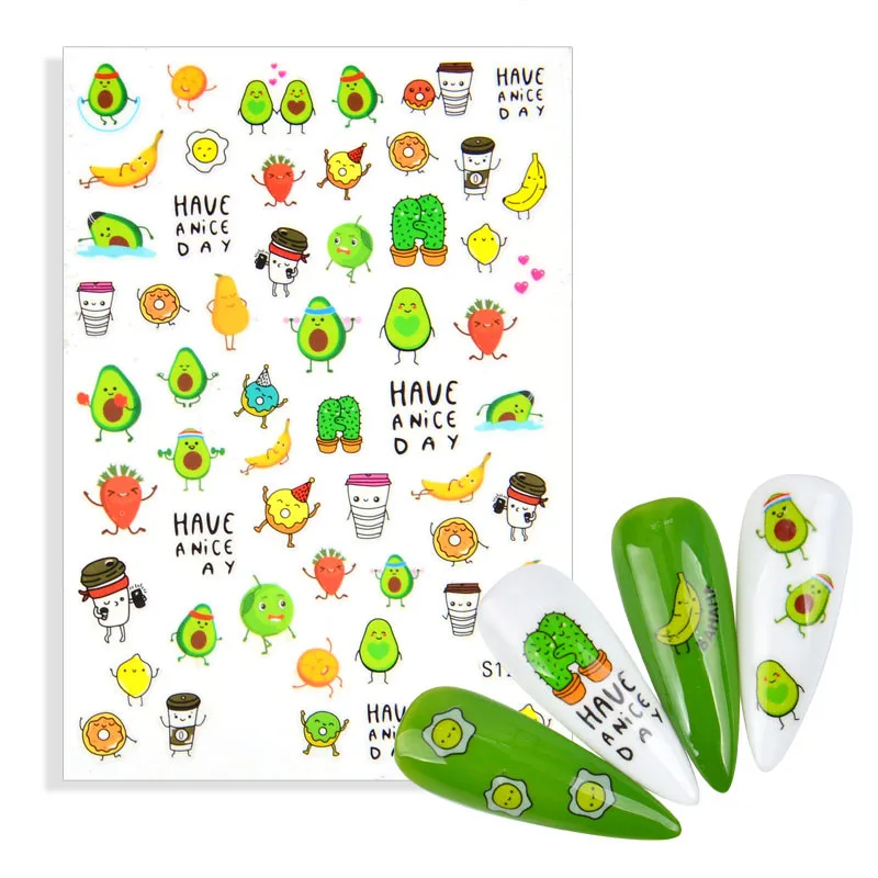 Новинка 2022 года, 3D стикеры для ногтей, Мультяшные персонажи, фрукты, ананас, авокадо, банан, наклейки для ногтей, фольга, клейкие переводки, украшения для дизайна ногтей