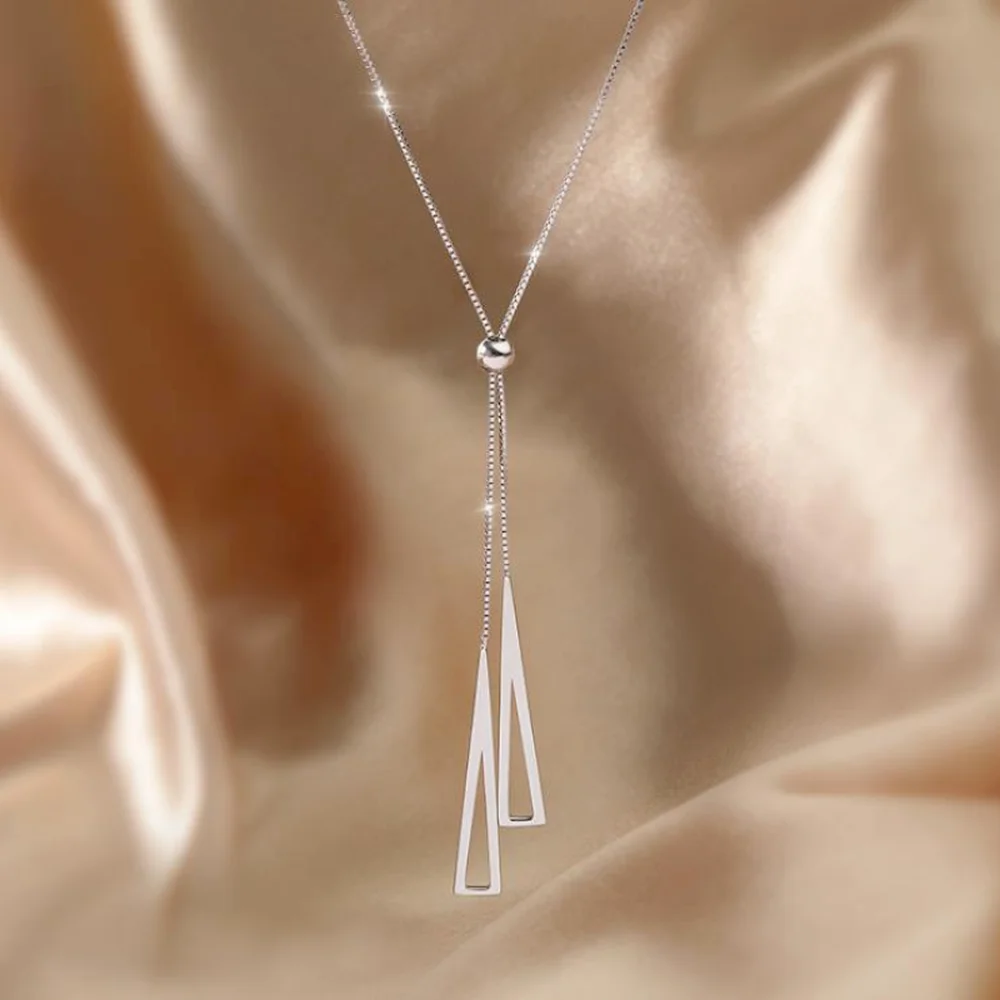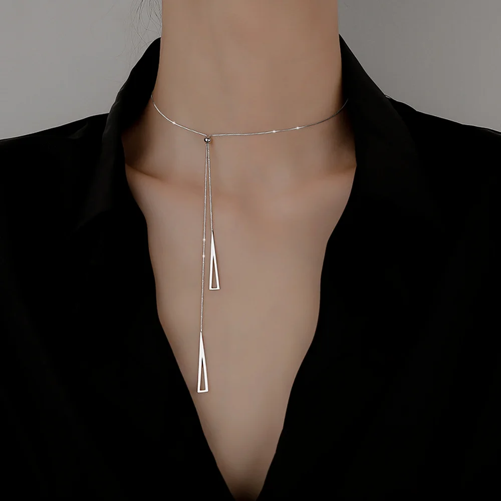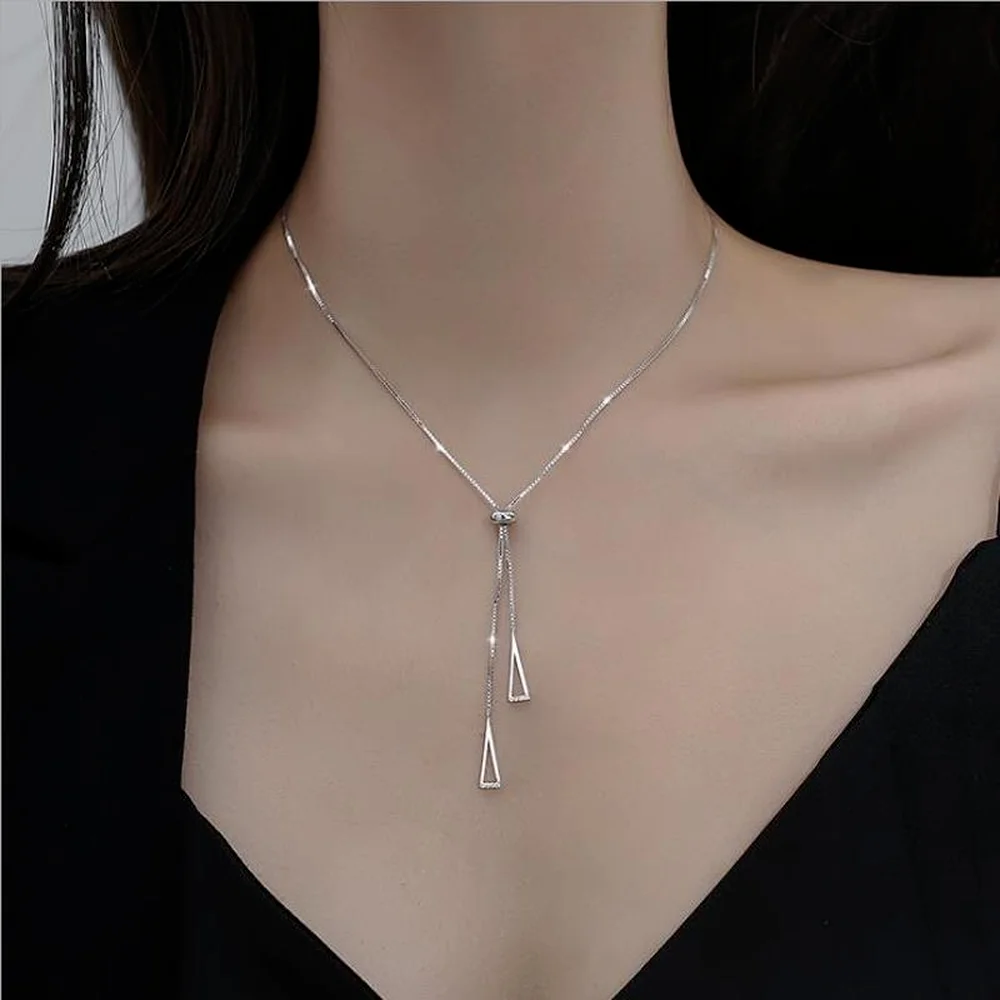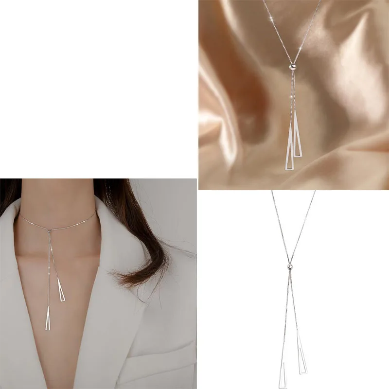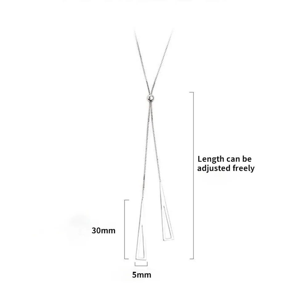 Это очень дизайнерское ожерелье. Кисточка может регулировать длину ожерелья. Есть много способов носить ожерелье. Вы можете сочетать свою различную одежду по желанию. Классическое ожерелье с геометрическим треугольным элементом-Повседневное, простое, умное и интеллектуальное. Стильное ожерелье, которое можно носить во все сезоны. Это может быть цепочка для ключицы весной и летом, а цепочка для свитера-осенью и зимой. Он может сочетаться с четырьмя сезонами одежды.