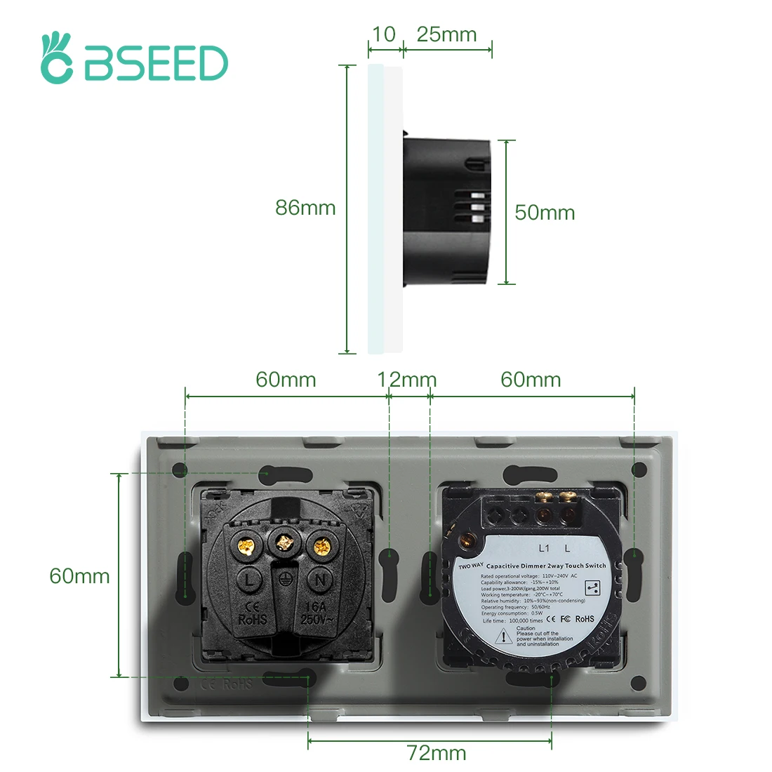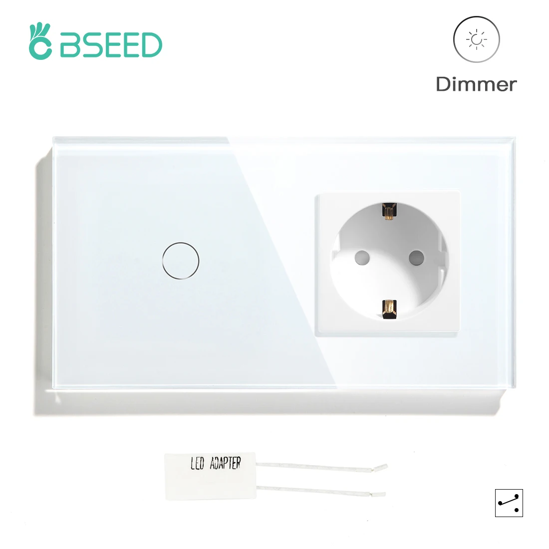 BSEED 1Gang 2Way настенный диммер, светильник, переключатель с регулируемой яркостью, сенсорный сенсор, переключатель, кристальная панель, стандарт ЕС, настенная розетка, 16А