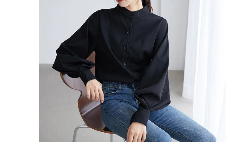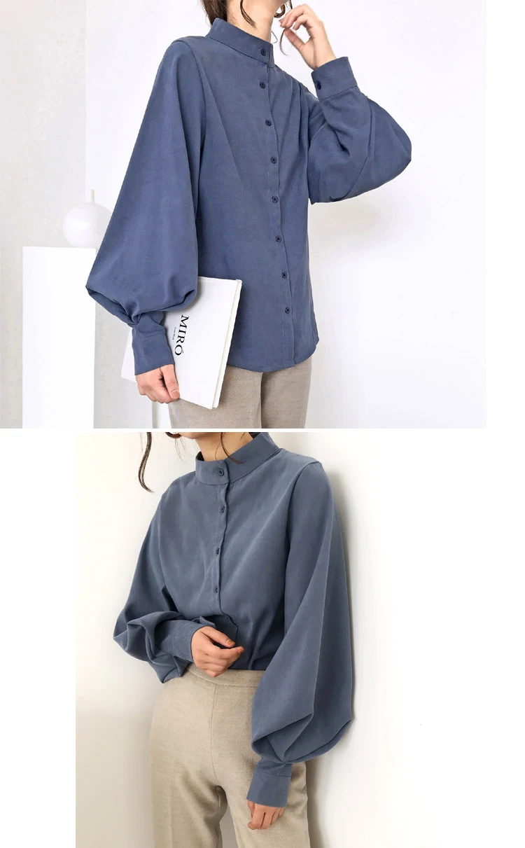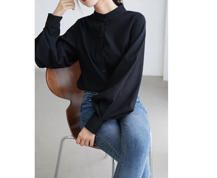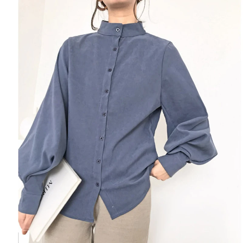 Женская блузка с длинным рукавом-фонариком, осенне-зимняя однобортная рубашка с воротником-стойкой, офисная блузка, однотонная винтажная 2021 рубашка