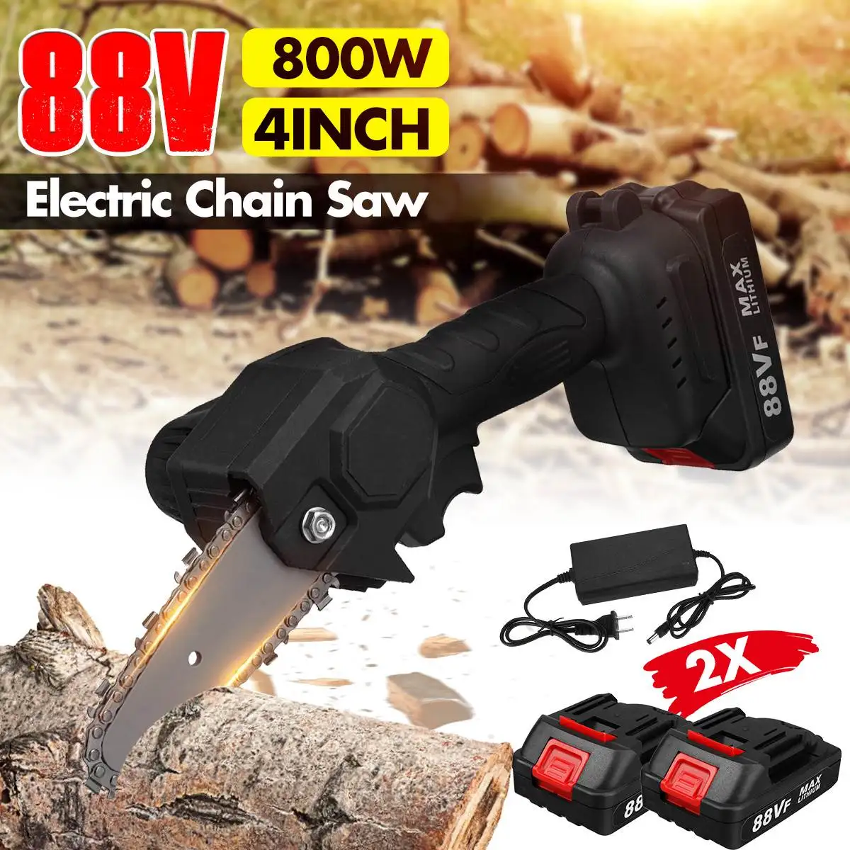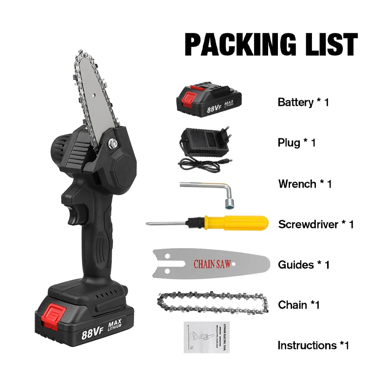 Мини-пила цепная электрическая, 800 Вт, 4 дюйма, 88 в, 2 аккумулятора