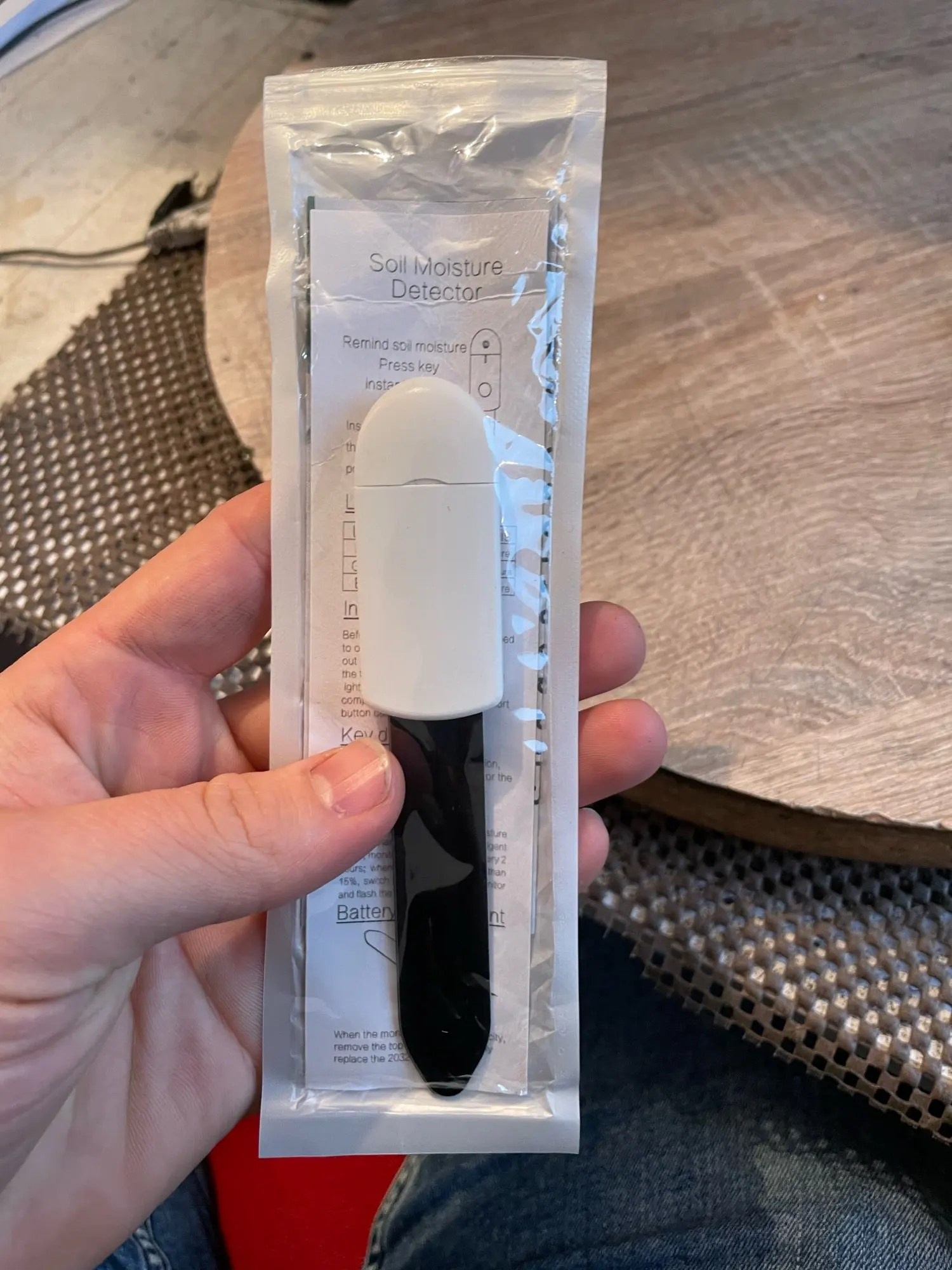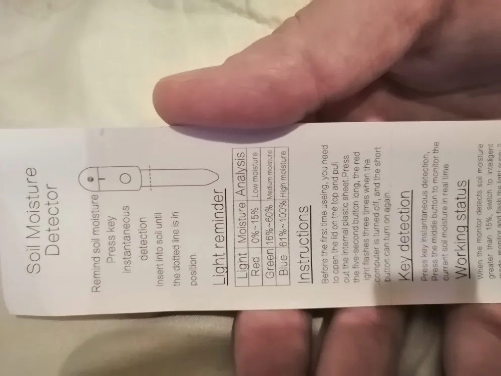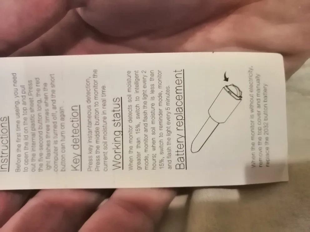 Батарейки внутри датчика, нужно снять крышку и вынять пластиковую прокладку между батареей и платой. Вставил в горшок с цветами и полил, вроде показывает , в двух зелёный в одном голубой. Как точно будет показывать прибор посмотрим в дальнейшем. --------------------------- Доставка быстрая неизвестной компанией в Израиль.