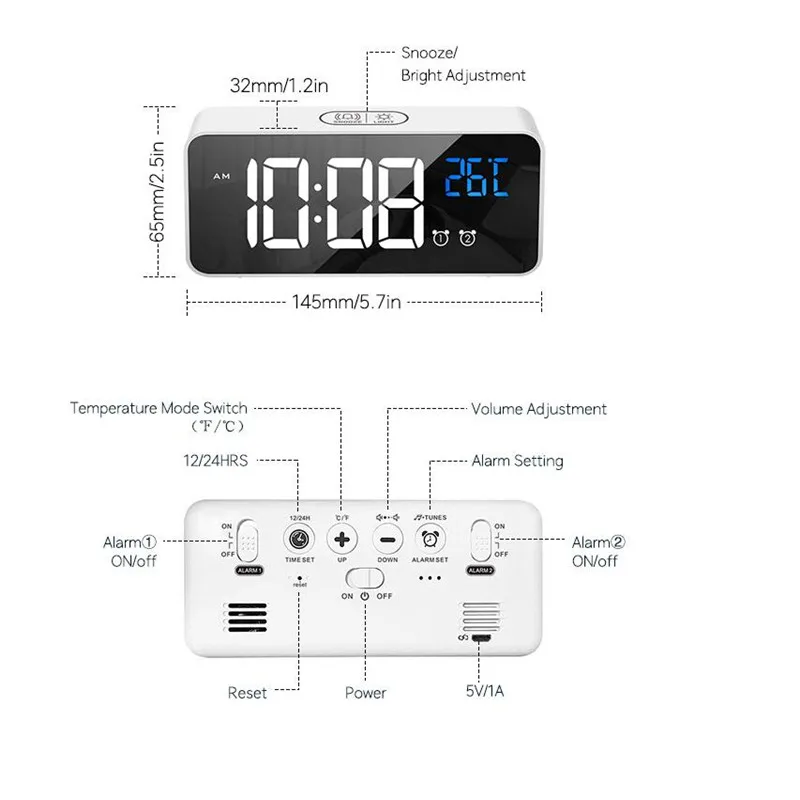 Особенности:1. Светодиодный цифровой дисплей времени, даты и температуры на одном и том же экране2. Отображение температуры, может переключаться между фаренгейтом и цельсием3. Этот продукт не имеет функции зарядки и должен использоваться с USB-кабелем для передачи данных4,24 часов/12 часов преобразования5,40 Будильник Музыка на выбор6. Громкость будильника можно регулировать вручнуюСветодиодный дисплей 7,5 уровня с регулируемой яркостью8. Два набора будильников управляются независимо. Функция будильника 5 дней 7 рабочих дней. Продолжительность будильника 2 минуты9. Можно устанавливать на стену или на рабочий столПосылка входит:1 * часы1 * Руководство пользователя на китайском/английском языках1 * USB-кабель для передачи данных