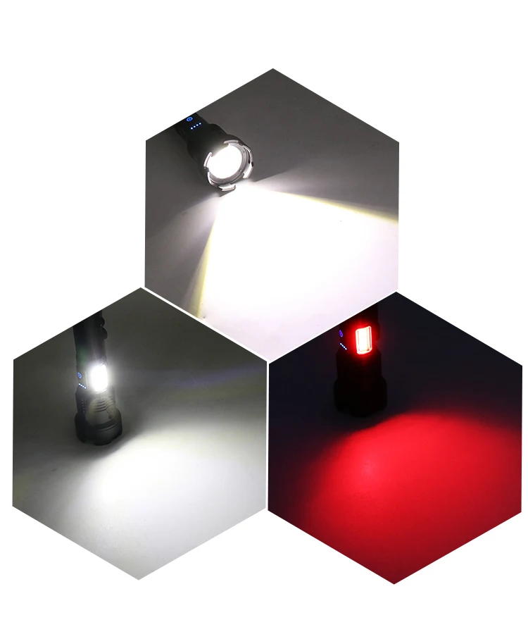 1. Название бренда: AEFJ3. Бусины: XHP1603,7-режимы: основной светильник 3 режима; COB 4 режима4. Срок службы лампы: 100000 часов5. Цвет Фонарика: черный6. Излучаемый Цвет: белый светильник7. Переключатель: кнопочный переключатель8. Чехол Материал: Прочный авиационный алюминий9. Расстояние освещения: более 200 метров10: светодиодный срок службы: более 100000 часовРежимы переключения:Основной светильник: 3 режима (высокая-низкая-вспышка)COB 4 режима: белый высокий белый низкий красный светильник-красная вспышка)