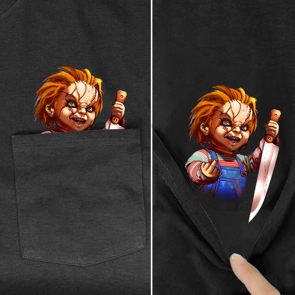 Футболка CLOOCL с карманом, летняя забавная Футболка с принтом Чаки, средний палец, мужские и женские Рубашки, Топы, Мультяшные хлопковые черные футболки