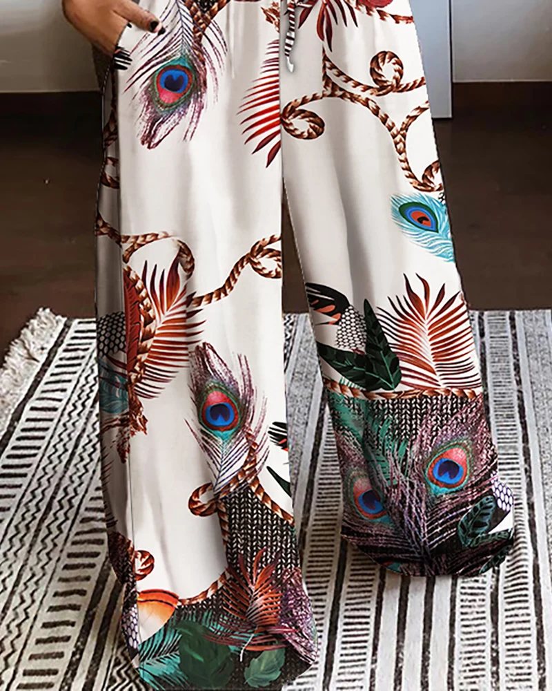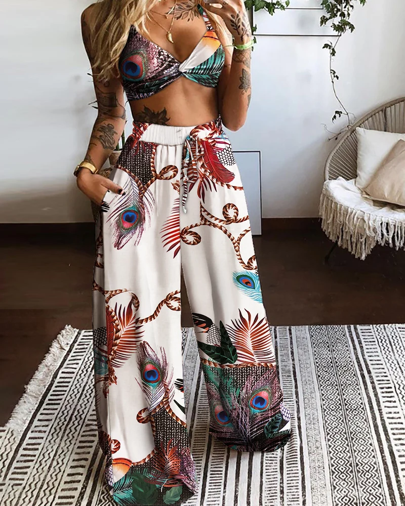 Комплект женской одежды из двух предметов, белый топ с принтом и лямка через шею и длинные удобные штаны, комплект одежды, 2021