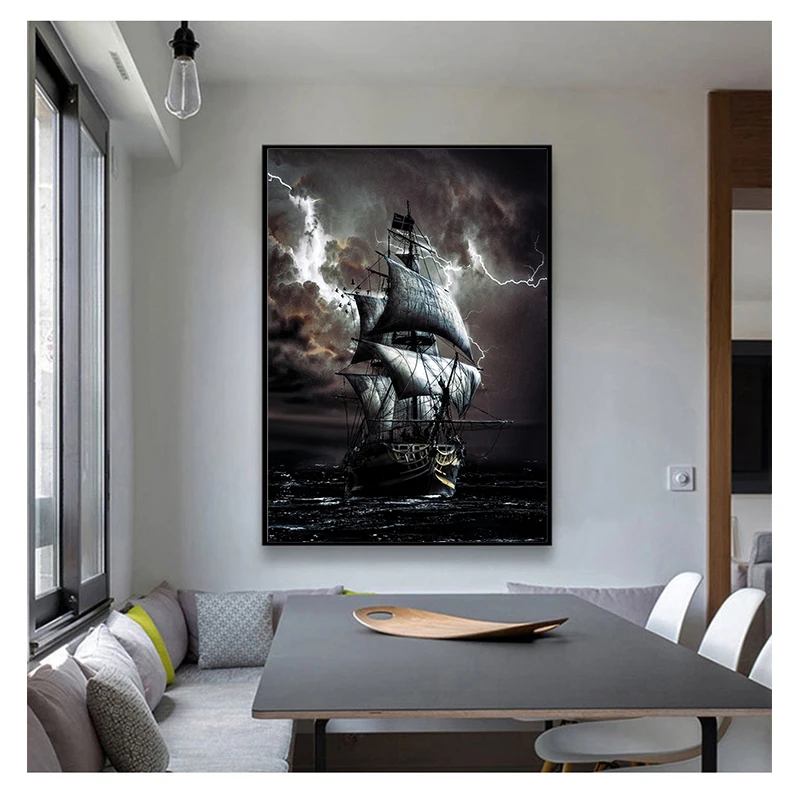 Картина маслом пиратский корабль, черный парусный корабль на холсте, ретро постер для офиса, гостиной, украшение для дома, судно без рамки