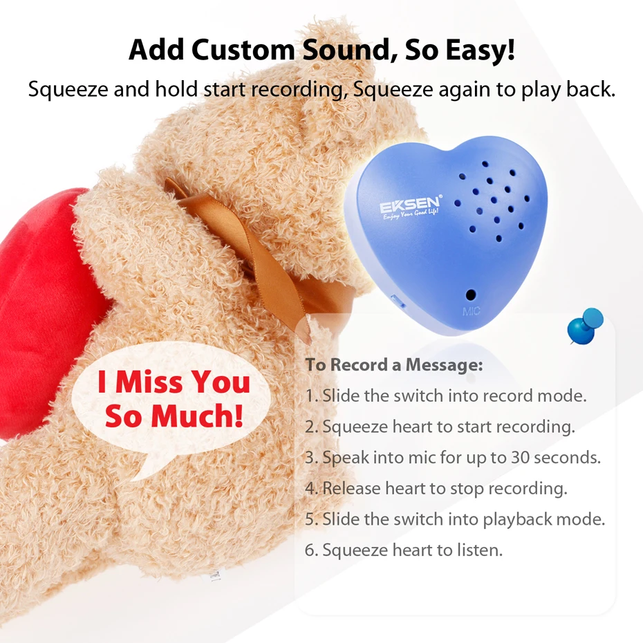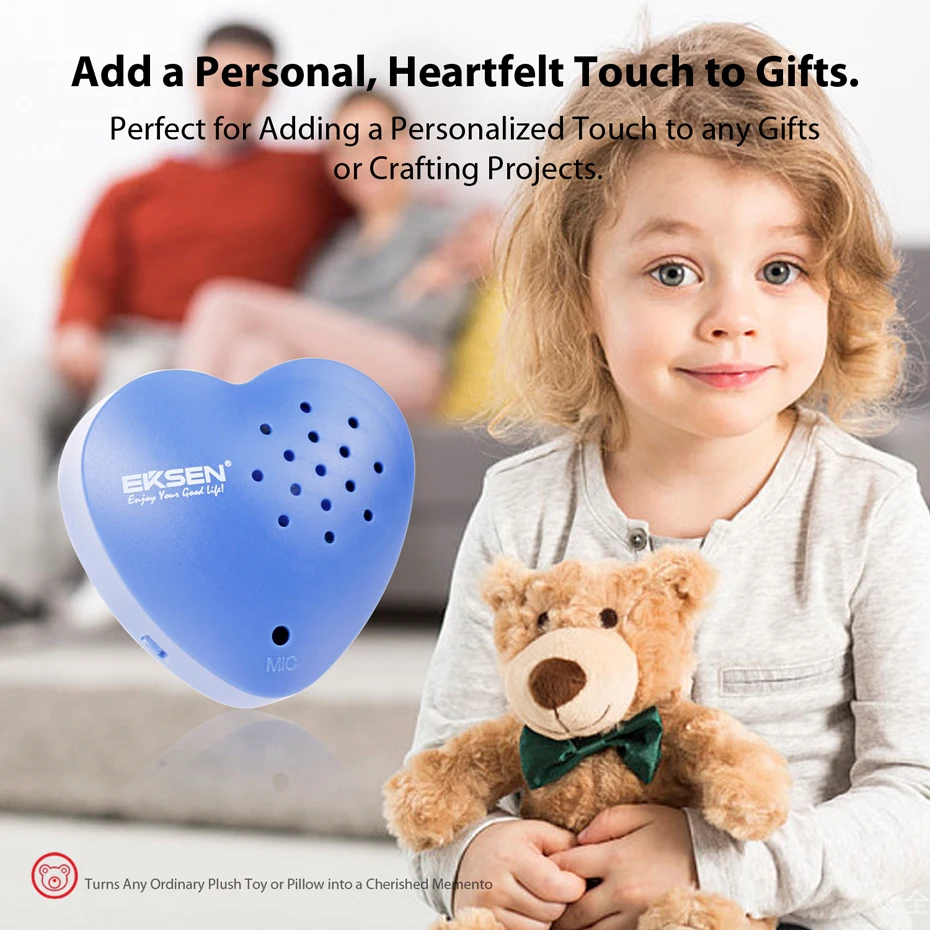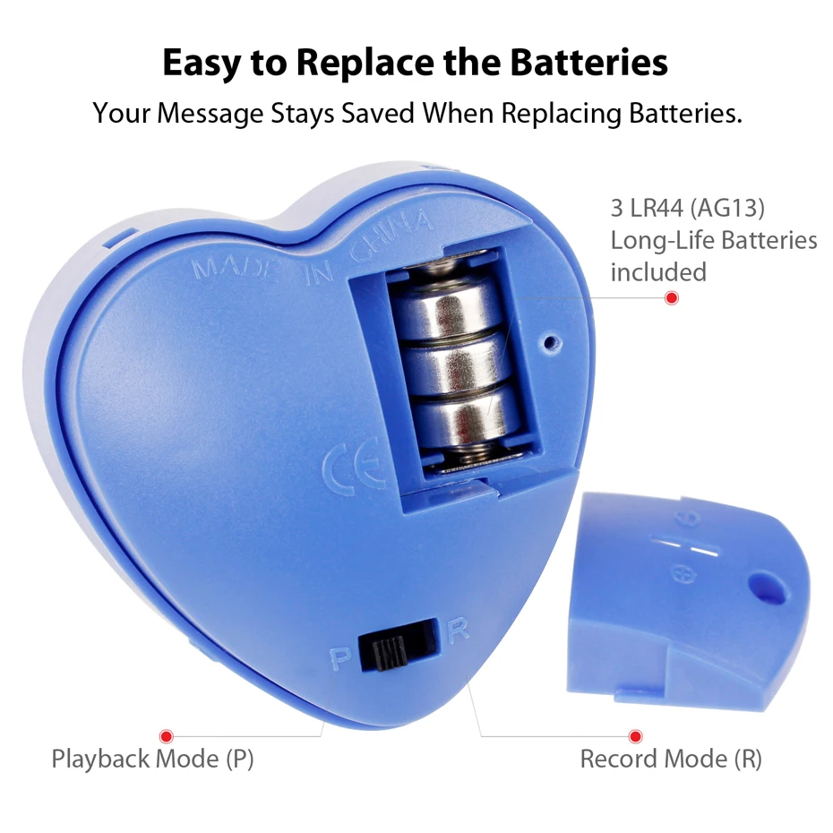 Диктофон EKSEN в форме сердца, модуль записи звука за 30 секунд для мягких животных, плюшевых игрушек, кукол и т. д. легко записывать, идеальное устройство для подарков своими руками.Создавайте индивидуальные подарки для близких и друзейУникальная идея подарка-идеально подходит для дней рождения, юбилеев, праздников, Дня Святого Валентина, Дня матери, свадьбы и помолвки, Рождества и других торжеств. Устанавливается в мягкие игрушки, плюшевые игрушки, куклы, подушки, одеяла и т. д.Для записи всего 6 шагов.1. Переключите переключатель в режим записи (R)2. Сожмите и удерживайте сердце, чтобы начать запись3. Говорите в микрофон до 30 секунд4. Отпустите сердце, чтобы закончить запись5. Переключите переключатель в режим воспроизведения (P)6. Сожмите и отпустите сердце, чтобы слушать.Советы по записи:-Перед записью сообщения, пожалуйста, сначала вытащите полосу изолятора аккумулятора на задней стороне регистратора.-Чтобы получить наилучшее качество звука, говорите громко, четко и устойчиво в микрофон. Поддерживайте от 3 до 5 дюймов между микрофоном и источником звука. Записывайте в обстановке и избегайте фонового шума.-Если вы допустили ошибку или хотите стереть голосовое сообщение, повторите шаги выше, чтобы записать новое сообщение.-Если вы удалили или не нуждаетесь в сообщениях, переместите переключатель в режим записи (R), нажмите и удерживайте сердце в течение 2-3 секунд. Он будет перезаписывать или удалять все самостоятельно.Что в коробке?-Диктофон с сердцем x 1 (синий)-Инструкция по эксплуатации x1