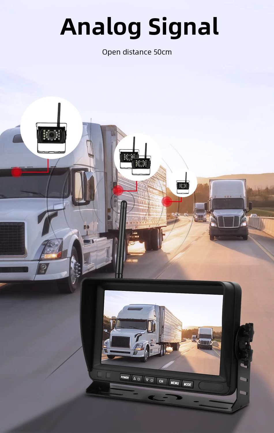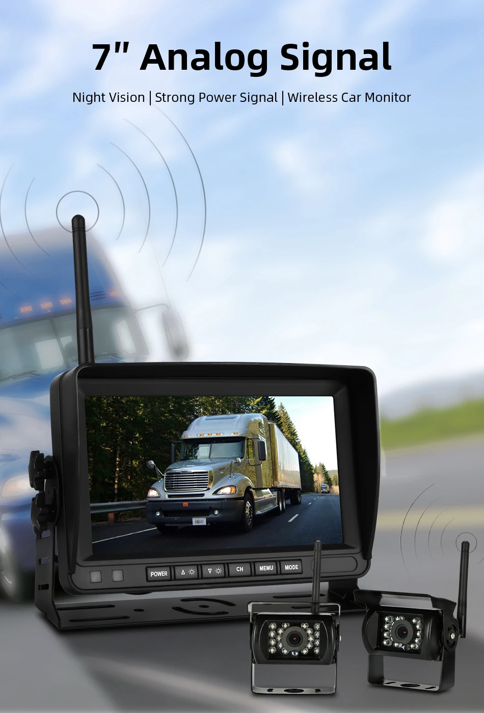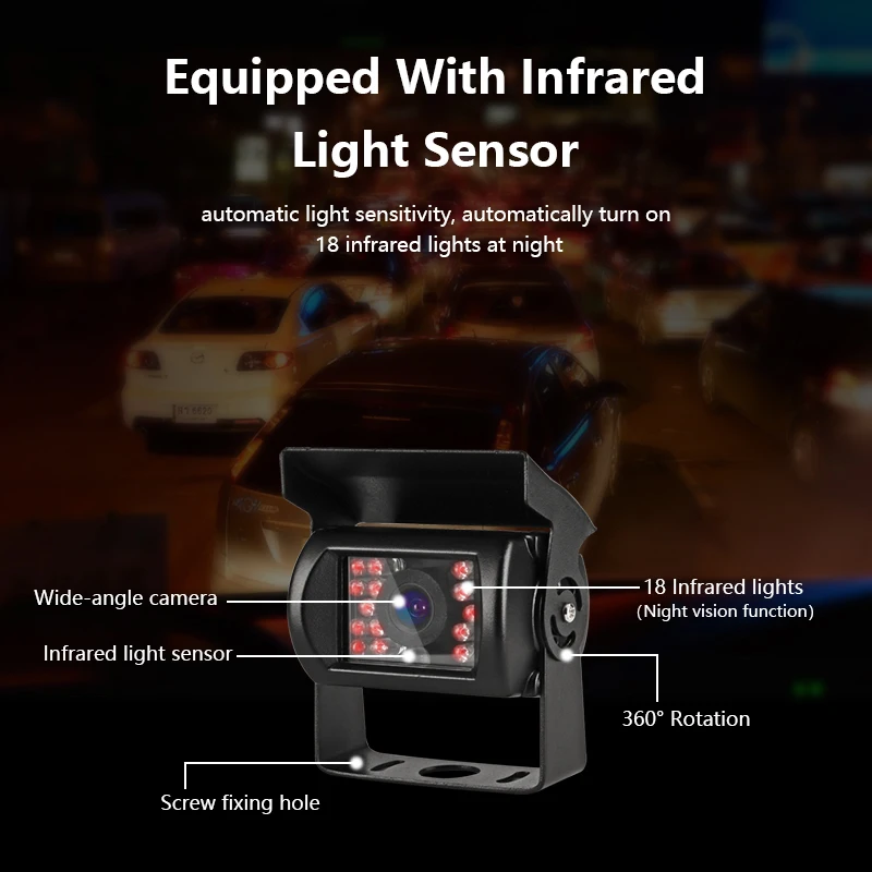 Характеристика:7-дюймовый высокой четкости на тонкопленочных транзисторах на тонкоплёночных транзисторах ЖК-дисплей широкоэкранный дисплей-Варианты беспроводной камеры: 1/2/3/4 несколько вариантов-Беспроводной сигнал позволяет избежать утомительного соединения между камерой и дисплеем-Оснащен инфракрасной светильник с датчиком, автоматический светильник Датчик 18 инфракрасный светильник s автоматически включаются в темное время суток, независимо от того, для вождения в ночное время или парковка на обочине, это безопаснее, И вы можете четко видеть окружающую среду даже в полной темноте