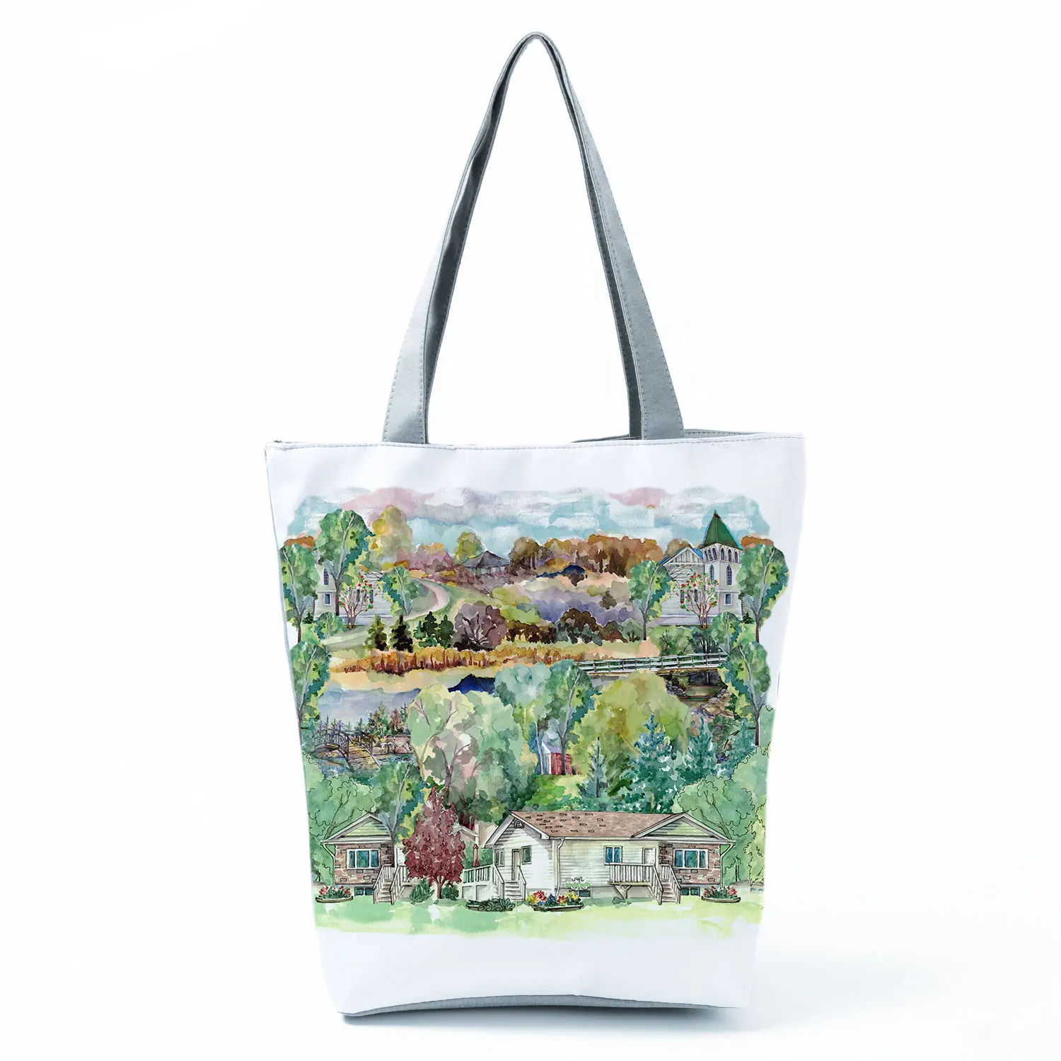 Женские сумки с принтом пейзажа, Простые Модные сумки через плечо с горами, деревьями и облаками, Экологичная Портативная сумка для покупок