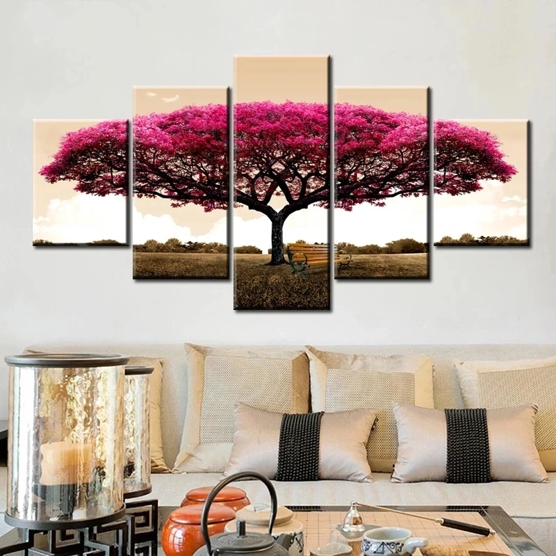 5 панелей, абстрактная красная картина маслом на холсте с изображением дерева, плакаты и принты, пейзаж, настенные картины, домашний декор для стен