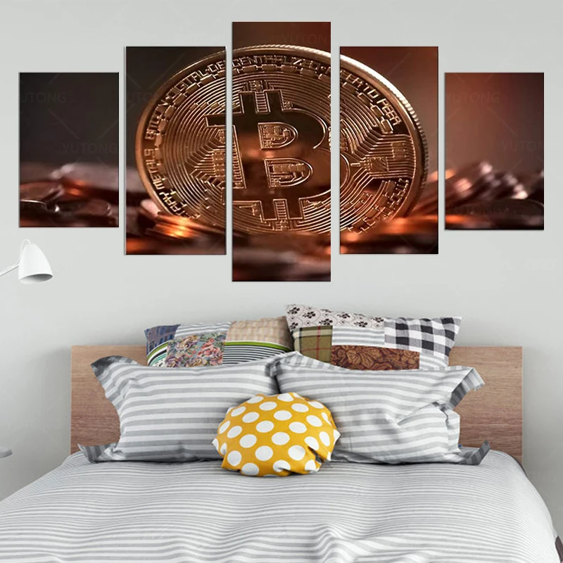 HD печать 5 шт. холст художественные картины плакат деньги монеты крупным планом Биткоин Виртуальная валюта картины современная настенная художественная комната