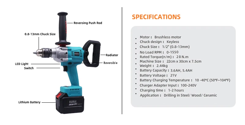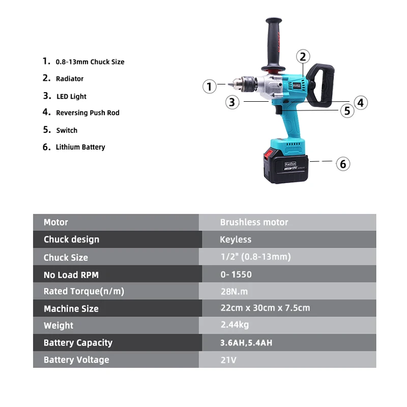 Дрель электрическая KANDUO 3 в 1, 21 в, 13 мм, с бесколлекторным дв...