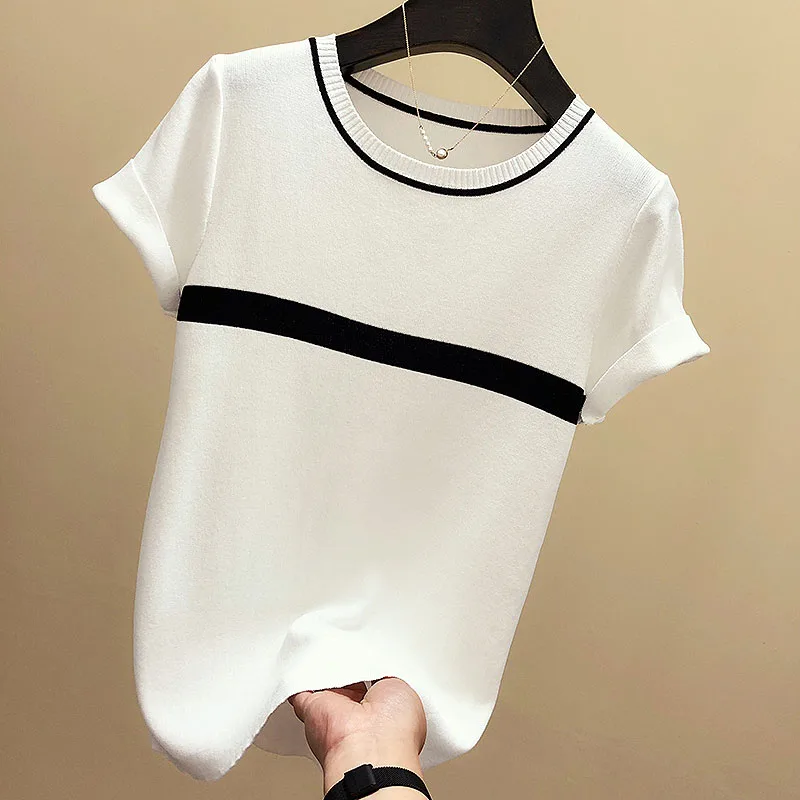 Футболка женская трикотажная в полоску, с круглым вырезом и коротким рукавом