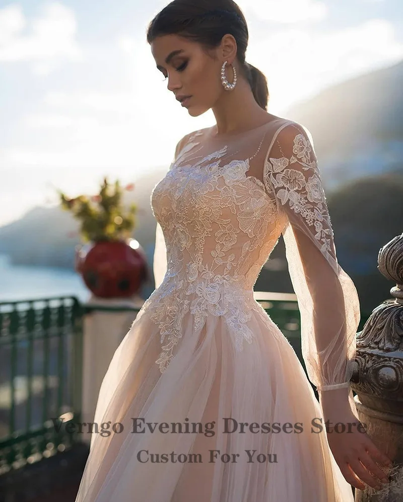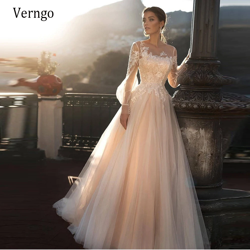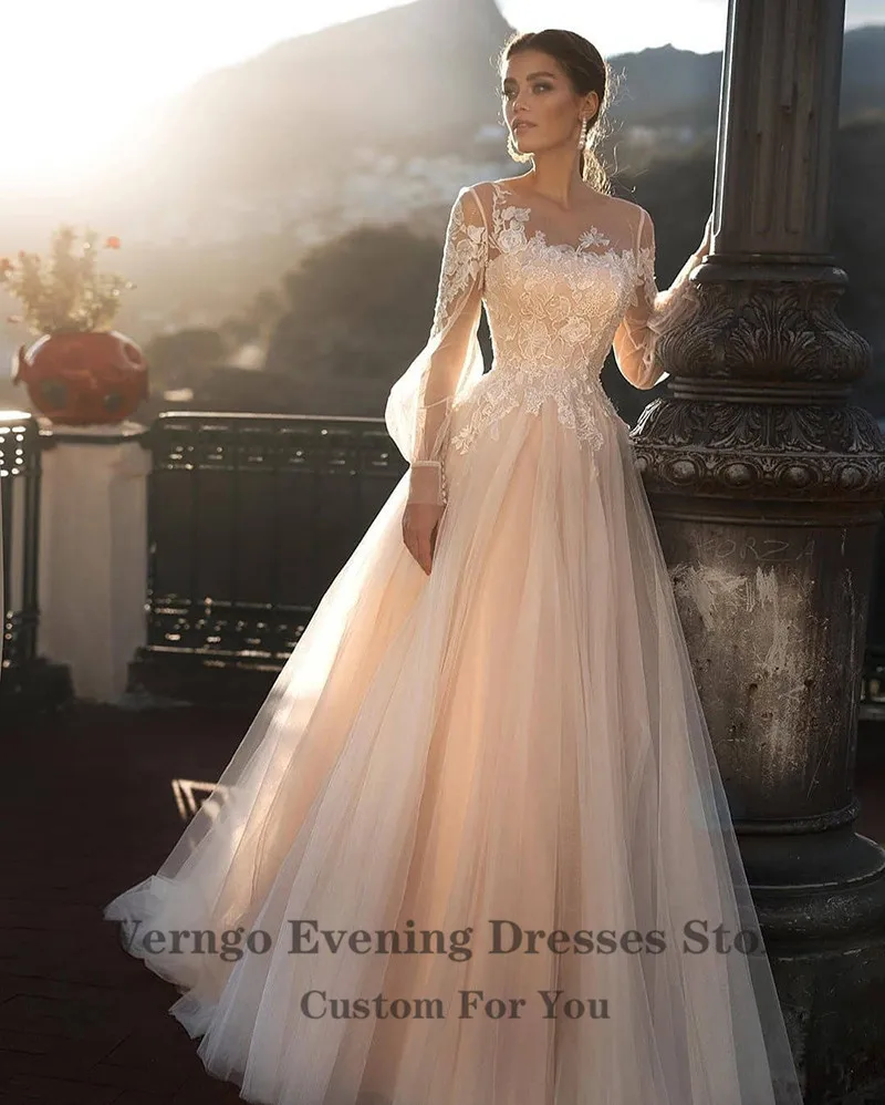 Verngo скромные светильник из тюля кремового цвета трапециевидной формы Выпускные платья одежда с длинным рукавом, с кружевными аппликациями, прозрачные и круглым вырезом пол Длина 2021 платья невесты