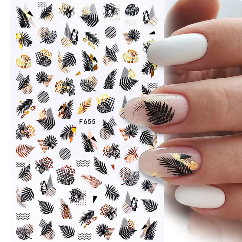 3D-Наклейки для ногтей, золотистые, черные, бронзовые листья, переливающиеся Геометрические линии, переводная наклейка для самостоятельного украшения ногтей, 1 шт.