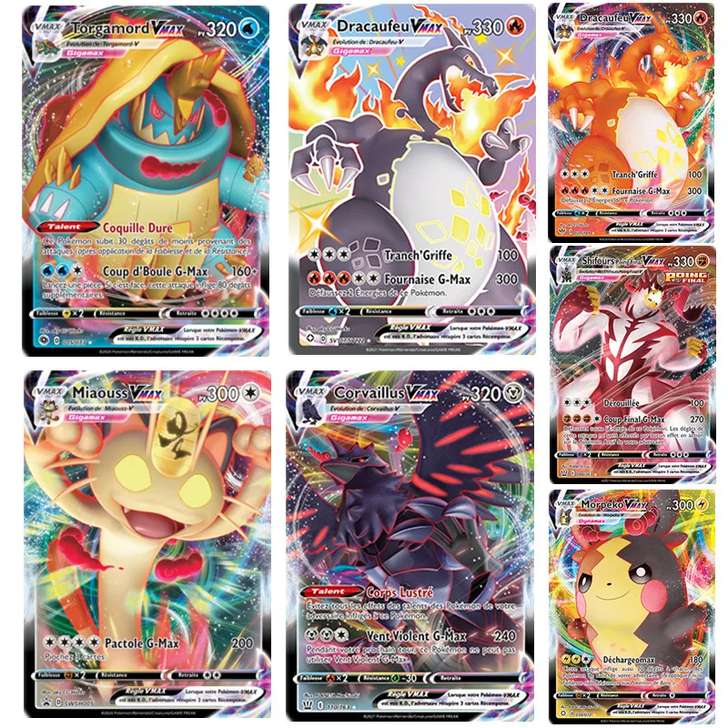 100 шт. Покемон VMAX 70GX 20 Мега 10 тренер французские карты Dracaufeu Пикачу торгаморд сколоцендре игра коллекция игрушек В наличии!100 шт Pokemon VMAX карты Dracaufeu Pikachu Torgamord Victini Scolocendre Morpeko Trading ..Коллекционные игрушки для карточной игры