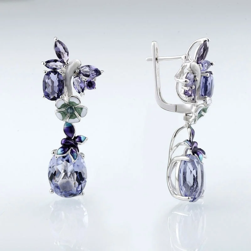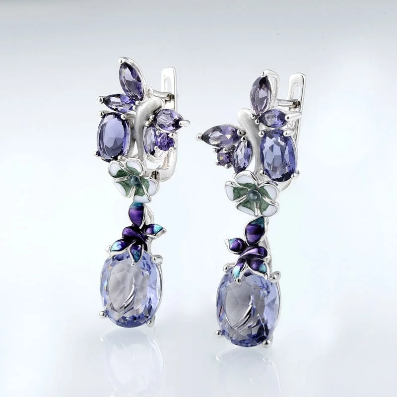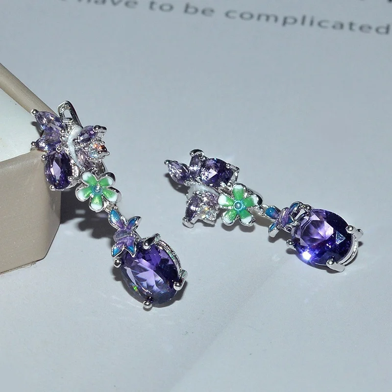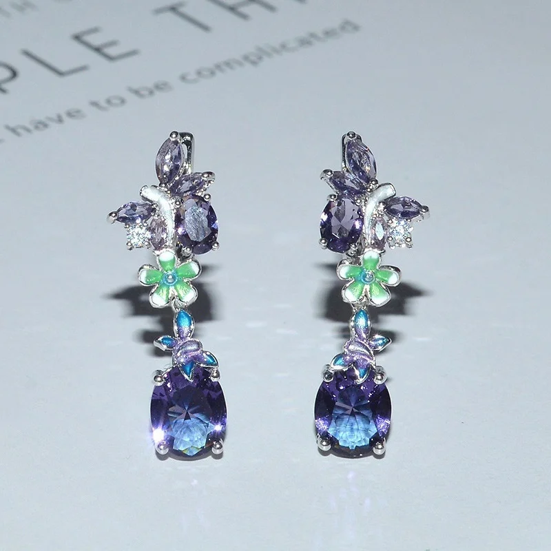 Роскошные длинные висячие серьги для женщин серебро фиолетовый хрустальный цветок цветочный узор пользовательские Капли Серьги Элегантный Банкетный ювелирные изделия
