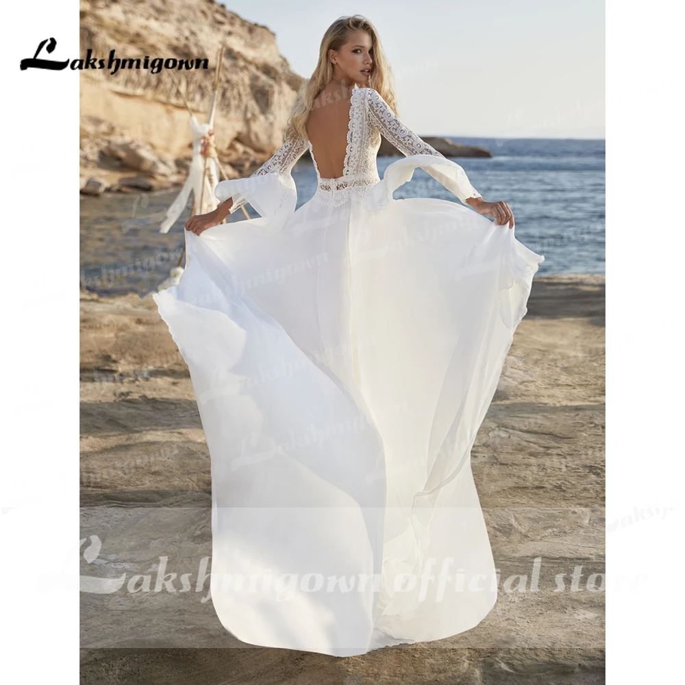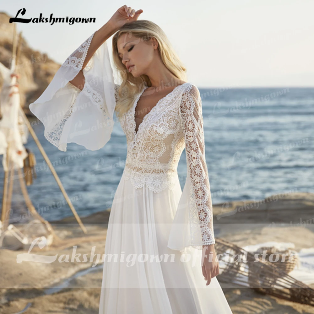 Новинка 2021, летние кружевные свадебные платья в стиле бохо, свадебные платья с длинными расклешенными рукавами и V-образным вырезом, свадебные платья с открытой спиной для невесты Lakshmigown
