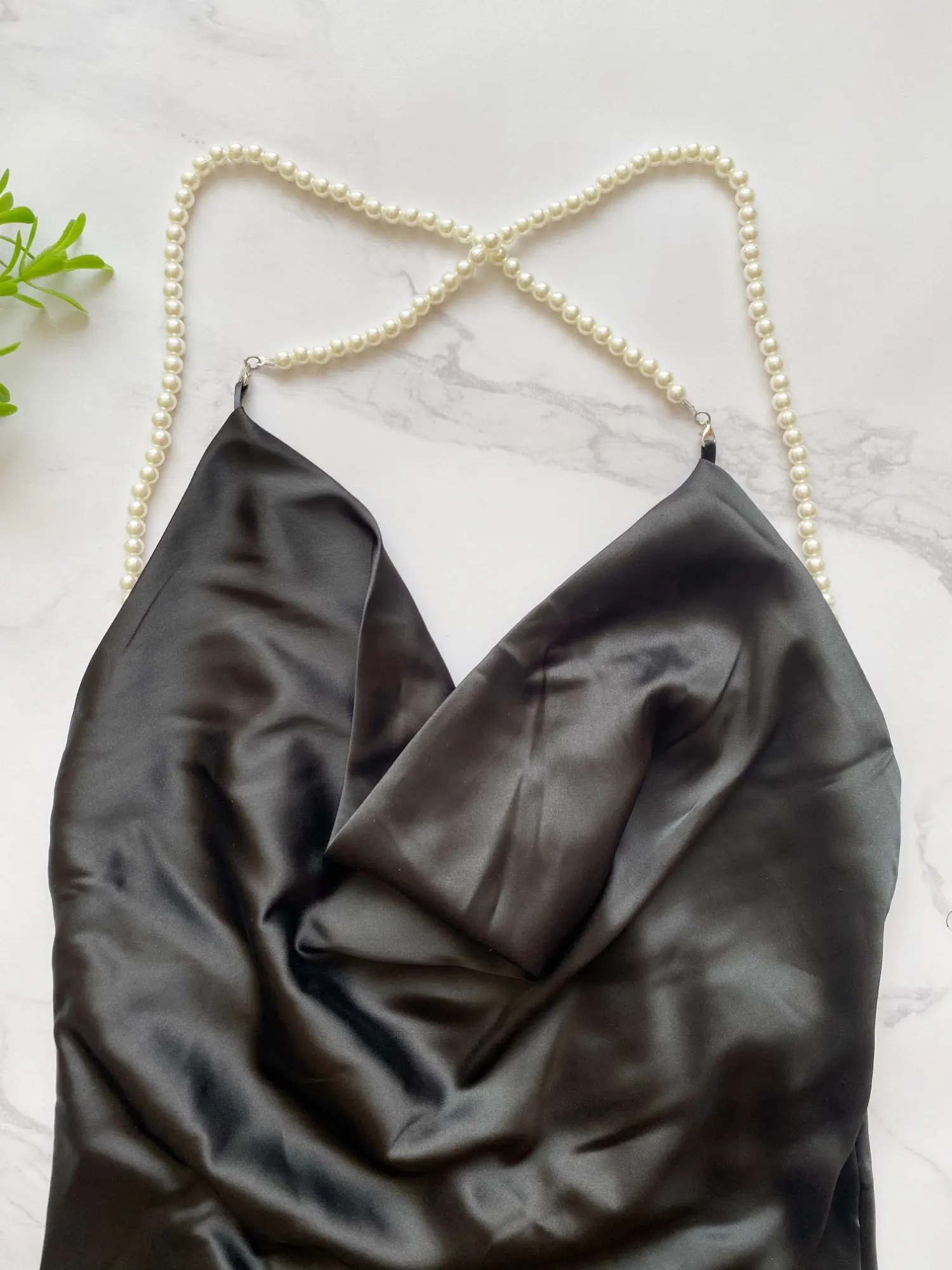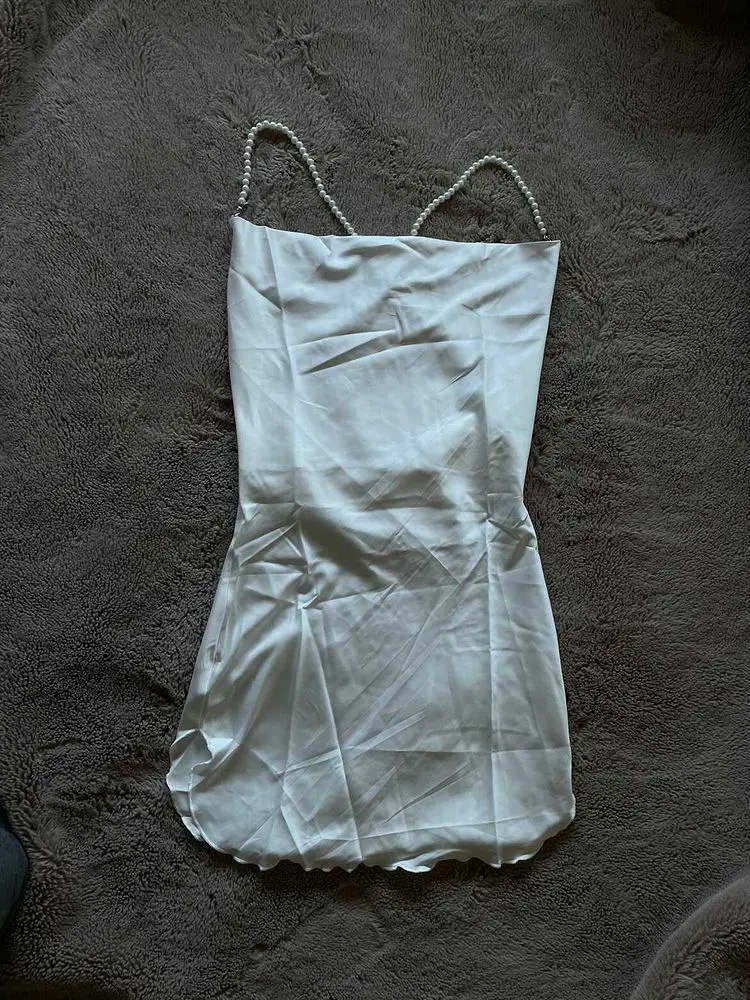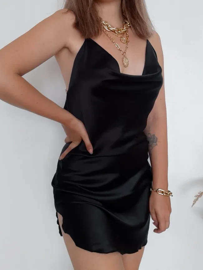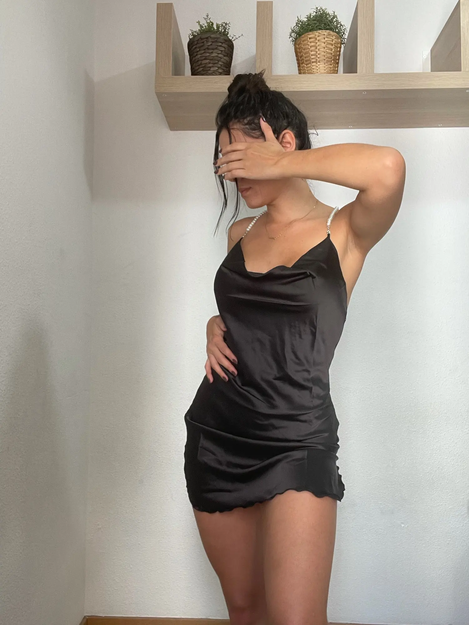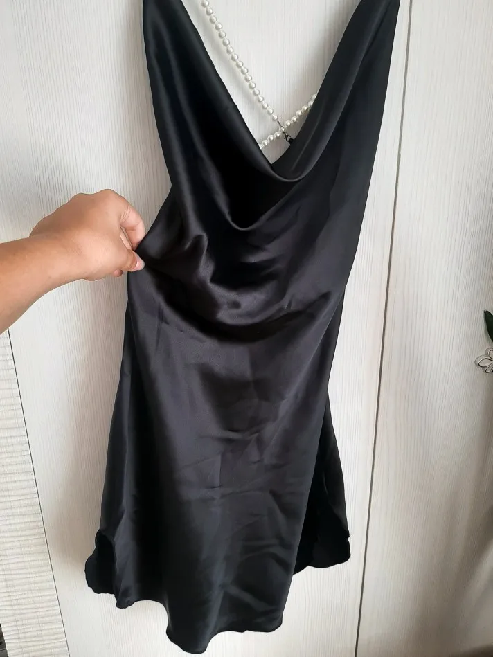 У продавца данное платье предоставлено в трех цветах, но я,выбрала чёрное и размер S. Мои параметры 88-68-92 рост 158см. Заказ в Беларусь прибыл за один месяц. Платье отличное ,на ощупь как атлас.Состав ткани полиэстер и хлопок. Платье само простое, его украшают шлейки в виде жемчуга и очень красивые вырезы . Шлейки можно снять ,легко застегиваются. По бокам два выреза, открытая спинка. В районе зоны декольте оно довольно свободное, но все что нужно прикрыто. Платье тонкое ,но не просвечивает. Мне очень нравится как оно сидит