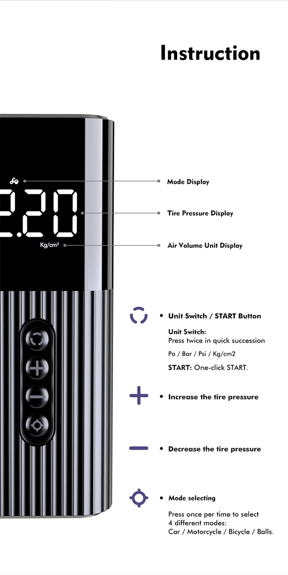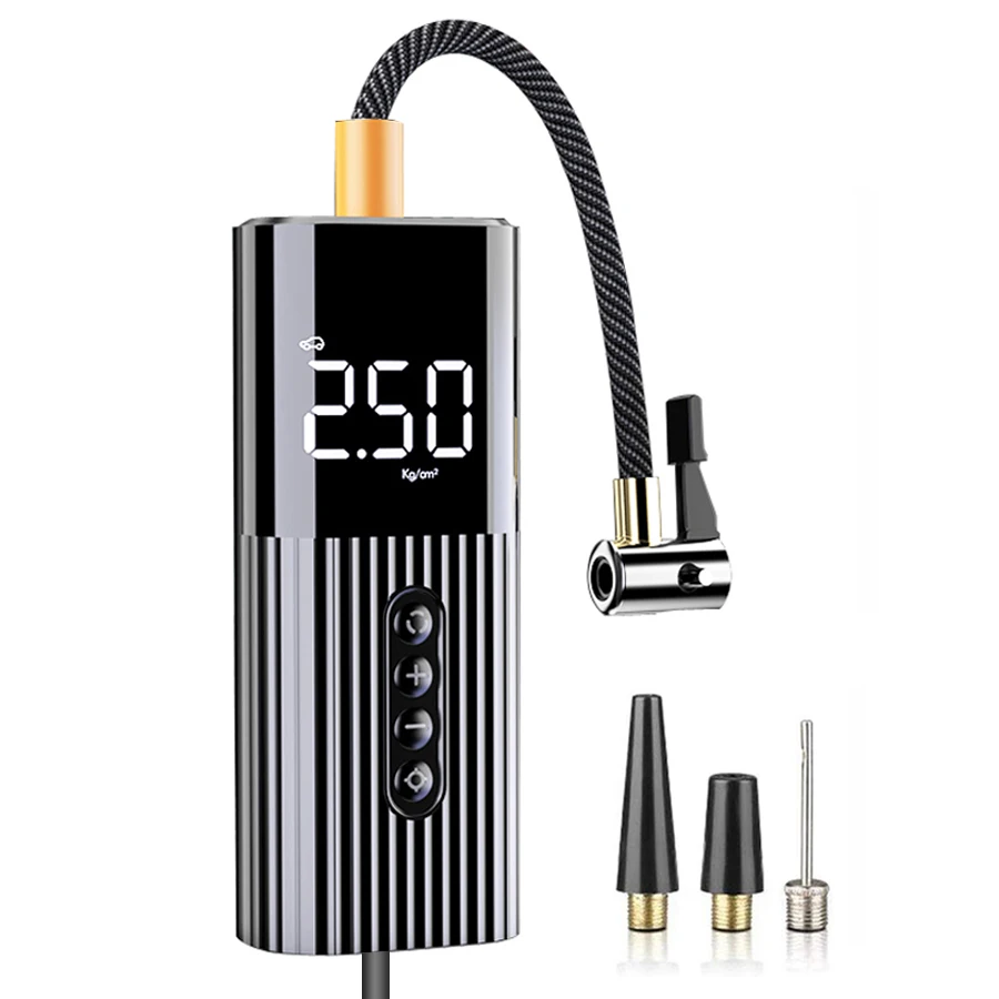 Как использовать: 1. Подключите кабель автомобильного зарядного устройства к автомобильному зарядному устройству.2. Подключите шланг к нижней сердцевина клапана шины.3. Нажмите на пряжку воздушного шланга, чтобы предотвратить утечку воздуха.4. Нажмите кнопку "Unit" для пробуждения ЖК-экрана.5. Нажмите кнопки «+» и «-», чтобы установить пресс для шин.6. Нажмите кнопку питания, чтобы начать инфляцию, и она прекратится автоматически, когда заданный пресс будет достигнут. Характеристика: 1. [проводной портативный дизайн] проводной дизайн и компактный миниатюрный размер этого шинного надувателя позволяют легко носить с собой и легко работать одной рукой. Вам нужно всего 4 шага, чтобы начать инфляцию.2. [быстрая автоматическая надувание] Накачка шин имеет 4 переключаемых блока давления (PSI, бар, кПа, кг/см2), поэтому вы можете задать давление в шинах по мере необходимости. Когда установленное давление в шинах будет достигнуто, насос для шин автоматически отключится. Максимальное давление надувания инфлятора составляет 100PSI.3. [ночного использования] накачанном состоянии, один светодиодный светильник будет автоматически светильник или похода по магазинам. Есть светодиодный индикатор в нижней части и дисплей давления в реальном времени на ЖК-дисплее. Вы можете удобно использовать цифровой инфлятор в качестве манометра и накачки в темноте.4. [Многофункциональный] Этот автомобильный воздушный насос является проводной но сканер штрих кода портативный с светильник вес, который может покрыть все шины велосипедов, мотоциклов, автомобильной промышленности (включая внедорожники). Также оснащен 3 адаптерами сопла для матрасов/летательных аппаратов/игрушек/спортивных мячей/надувных изделий. Спецификация: -Эффективность надувания: 15 л/мин-Давление надувания: 100 фунтов на квадратный дюйм (максимум)-Блок давления: PSI, бар, кПа, кг/см2-Внешний воздушный шланг длина: 13 см ± 0,5 см (5,1 ± 0,2 дюйм (ов)-Рабочая температура: 0 ℃- 60 ℃-Размер: 150*61*43 мм-Вес: 550 г-Максимальное Непрерывное время работы: 8 минут Посылка включает в себя: 1 * надувной насос воздушный компрессор1 * кабель прикуривателя1 * воздушный шланг1 * клапан Presta1 * шариковый штифт1 * игрушечная насадка1 * Руководство пользователя