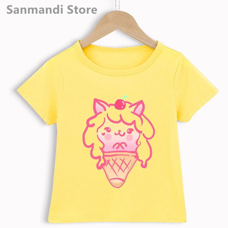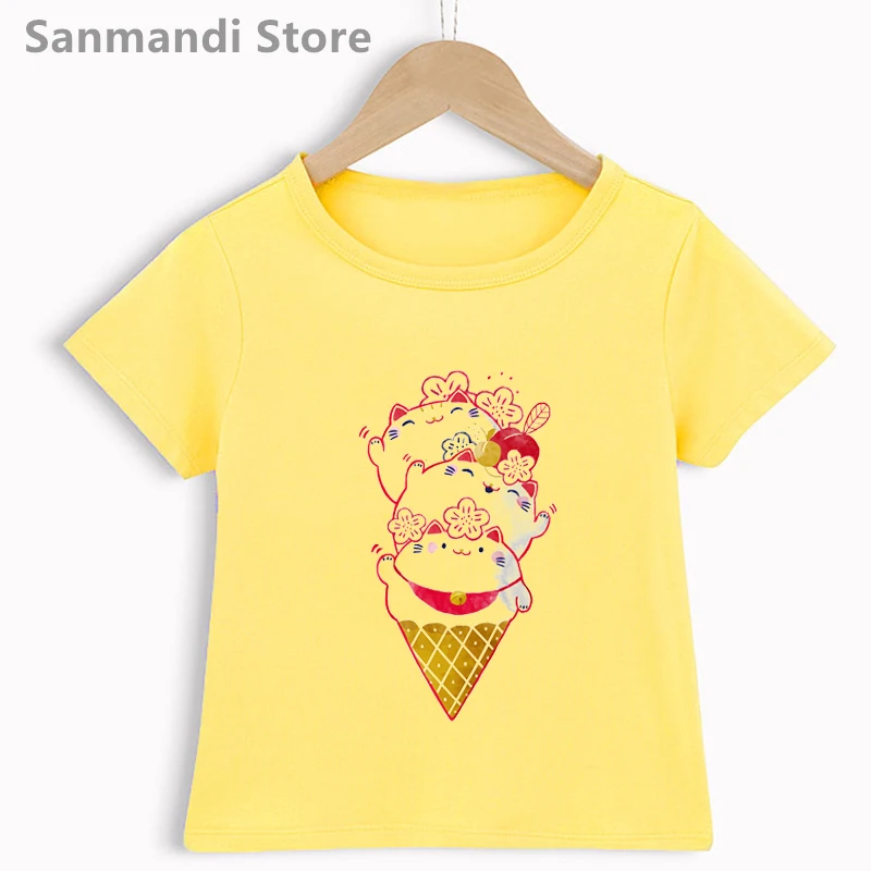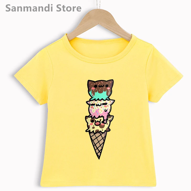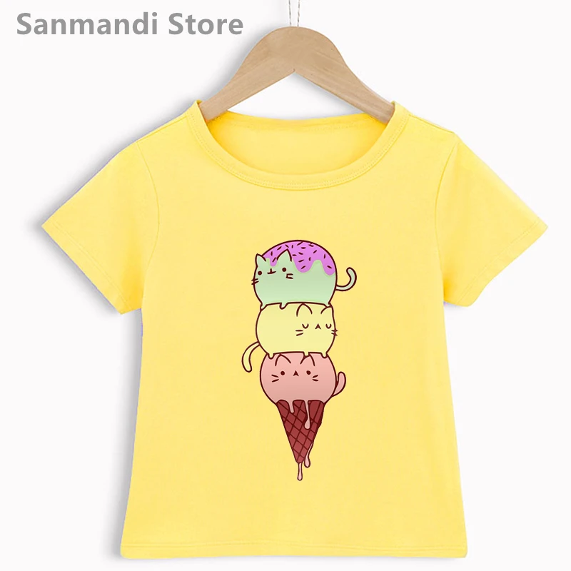 Новое поступление 2021, футболка с забавным котом и мороженым, детская одежда, желтая футболка с коротким рукавом, рубашка для мальчиков в стиле Харадзюку, летняя детская футболка