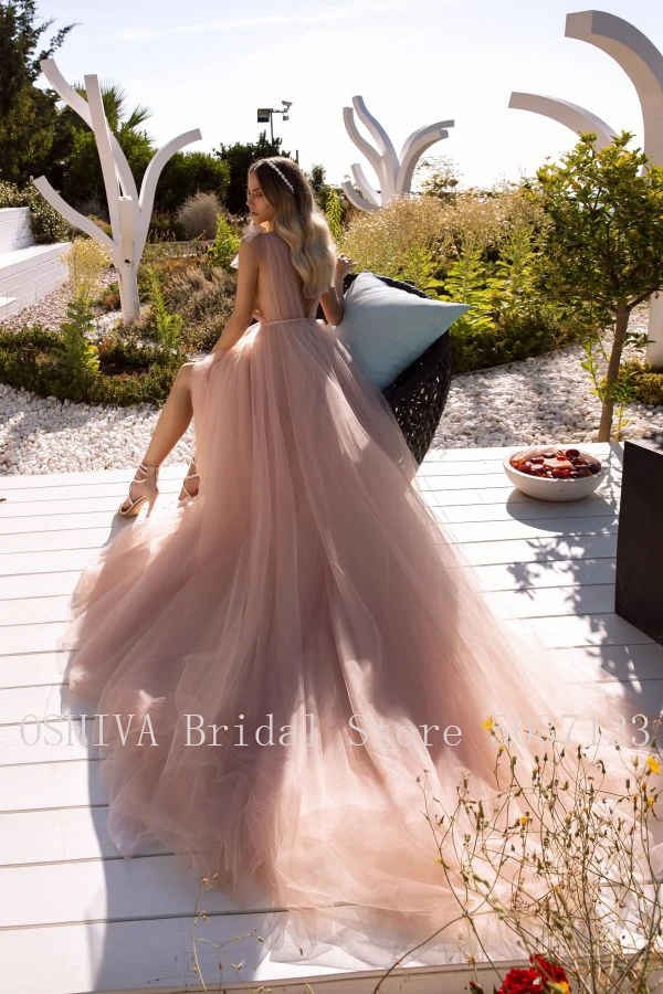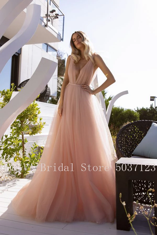 Новейшая модель; Нежно-розовый тюль Свадебные платья сексуальное платье с глубоким v-образным вырезом, открытая спина, Линия пола Длина невесты формальное вечернее платье с бисером пояс в богемном стиле