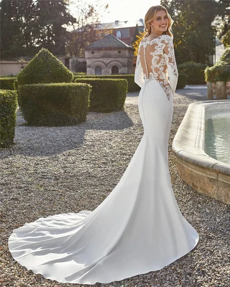 Женское свадебное платье с юбкой-годе, кружевное элегантное платье с V-образным вырезом, длинным рукавом, V-образным вырезом и аппликацией, со шлейфом и пуговицами сзади, 2021