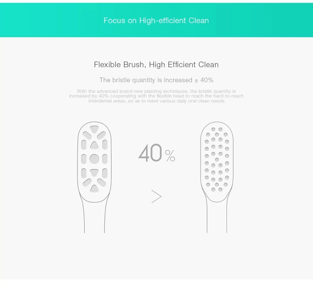 1. Высокоплотная американская щетина DuPont, без ржавчины, без металла, экологически чистая и здоровая.2. Дизайн Мини-головки помогает очистить труднодоступные межзубные области.3. Количество щетины увеличивается на 40 шт., и каждая щетина округлена, чтобы избежать царапин на поверхности зуба или повреждения десен.4. С напоминанием о сменном цикле, вы можете проверить оставшийся срок службы щеточных головок с помощью приложения.5. Подходит для звуковой зубной щетки Xiaomi Mijia.