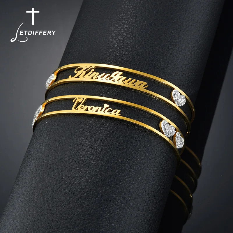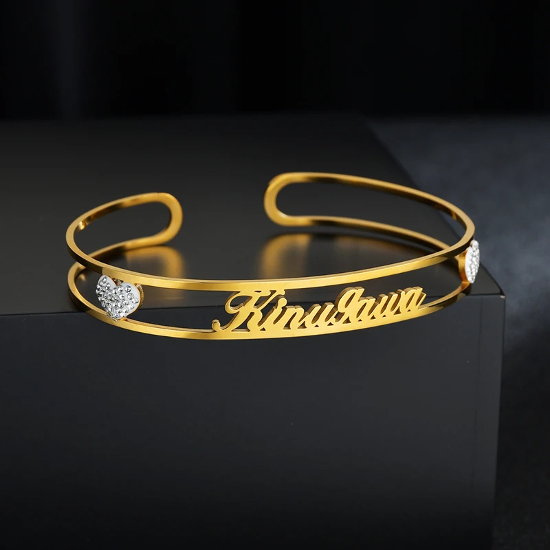 Индивидуальный циркониевый браслет с именем сердца для женщин, Золотая нержавеющая сталь, индивидуальная табличка, манжета