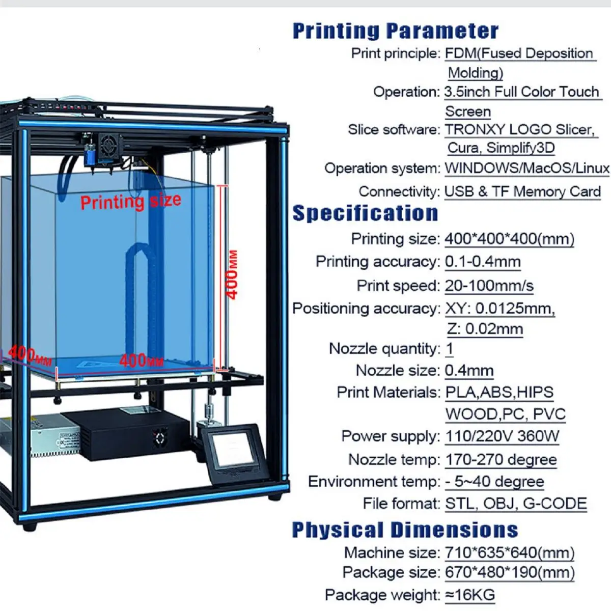 Особенности:-С большим размером печати 400*400*400 мм-С сенсорным экраном 3,5 дюйма, дизайн с двумя вентиляторами-С Экструдером Bowden, высокая точность для обеспечения лучшего качества печати-С двойным вентилятором сопла, супер теплоотдача-С улучшенным корпусом материнской платы, повышенной безопасностью и избежанием ошибок установки-С улучшенным пульсом, низким уровнем шума и стабильным движением-С обнаружением разрыва нити-С автоматическим выравниванием-Модернизированный шаговый двигатель и ремень, более стабильный и длительный срок службыОписание: