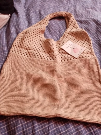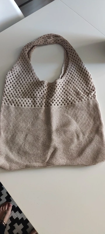 Сумка пришла за две недели. Почти все хорошо. На самом деле ручки у сумки немного коротковаты ( хотя допускаю, что они еще вытянутся). Сумка вязанная из плотной шерстяной (?) нитки. Без подкладки. Цвет замечательный. Не уверена, что буду носить, так как на моем толстеньком плече смотрится не очень.