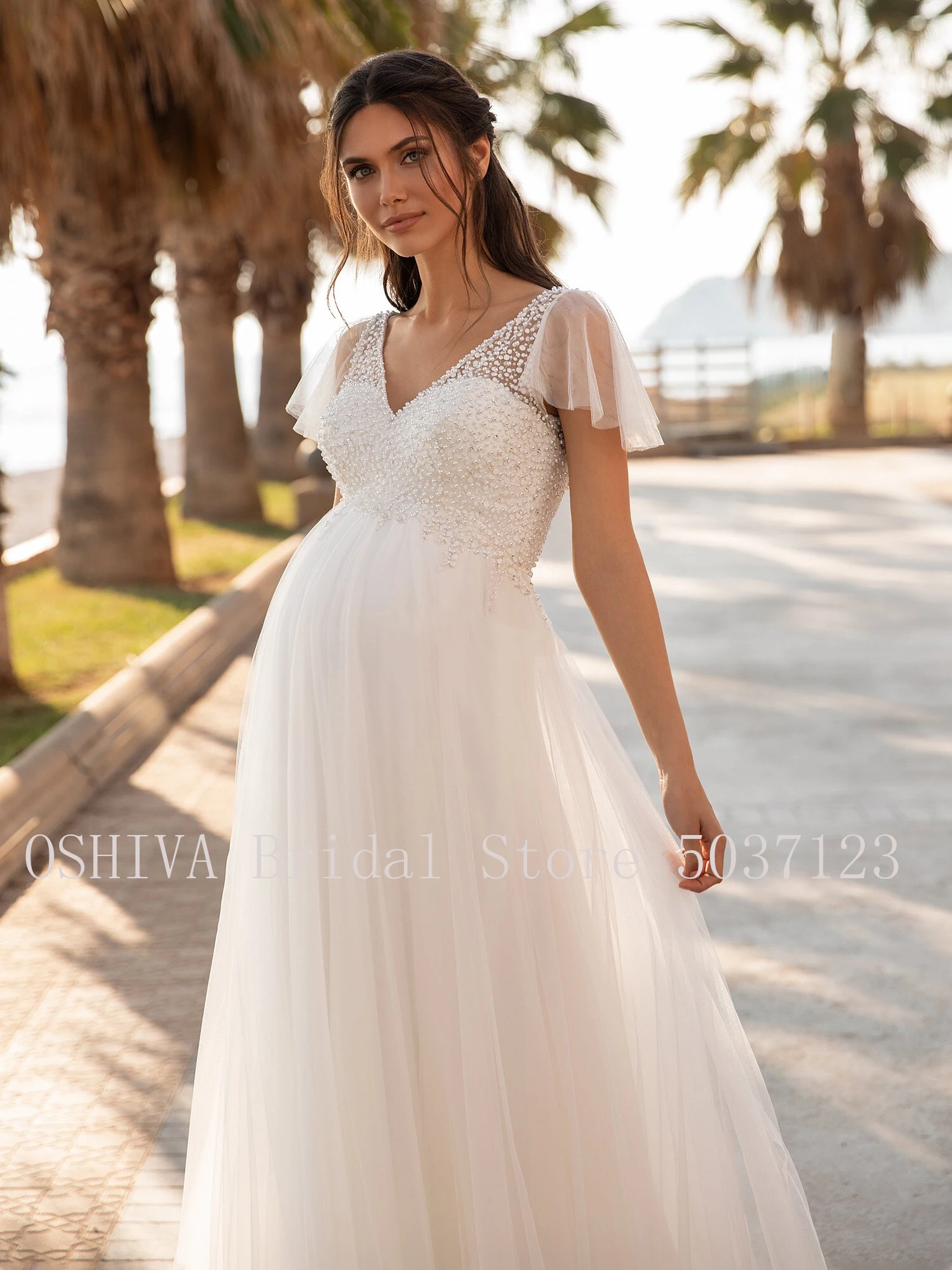 Богемные Свадебные платья для беременных женщин с V-образным вырезом и коротким рукавом простая Тюлевая трапециевидная юбка с блестками Дешевое платье для беременных невест 2021